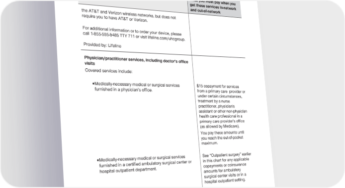 2024 Evidence of Coverage for UnitedHealthcare® Group Medicare Advantage PEBB Balance (PPO) Chapter 4: Medical Benefits Chart (what is covered and what you pay) 115 Services that are covered for you What you must pay when you get these services in-network and out-of-network the AT&T and Verizon wireless networks, but does not require you to have AT&T or Verizon. For additional information or to order your device, please call 1-855-595-8485 TTY 711 or visit lifeline.com/uhcgroup. Provided by: Lifeline Physician/practitioner services, including doctor’s office visits Covered services include: · Medically-necessary medical or surgical services $15 copayment for services furnished in a physician’s office. from a primary care provider or under certain circumstances, treatment by a nurse practitioner, physician's assistant or other non-physician health care professional in a primary care provider’s office (as allowed by Medicare). You pay these amounts until you reach the out-of-pocket maximum. · Medically-necessary medical or surgical services See “Outpatient surgery” earlier furnished in a certified ambulatory surgical center or in this chart for any applicable hospital outpatient department. copayments or coinsurance amounts for ambulatory surgical center visits or in a hospital outpatient setting. · Consultation, diagnosis, and treatment by a specialist. $30 copayment for services from a specialist or under
