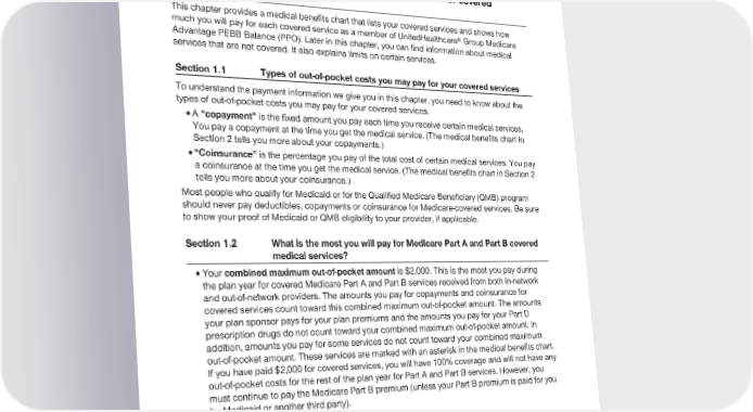 2024 Evidence of Coverage for UnitedHealthcare® Group Medicare Advantage PEBB Balance (PPO) Chapter 4: Medical Benefits Chart (what is covered and what you pay) 72 Section 1 Understanding your out-of-pocket costs for covered services This chapter provides a medical benefits chart that lists your covered services and shows how much you will pay for each covered service as a member of UnitedHealthcare® Group Medicare Advantage PEBB Balance (PPO). Later in this chapter, you can find information about medical services that are not covered. It also explains limits on certain services. Section 1.1 Types of out-of-pocket costs you may pay for your covered services To understand the payment information we give you in this chapter, you need to know about the types of out-of-pocket costs you may pay for your covered services. · A “copayment” is the fixed amount you pay each time you receive certain medical services. You pay a copayment at the time you get the medical service. (The medical benefits chart in Section 2 tells you more about your copayments.) · “Coinsurance” is the percentage you pay of the total cost of certain medical services. You pay a coinsurance at the time you get the medical service. (The medical benefits chart in Section 2 tells you more about your coinsurance.) Most people who qualify for Medicaid or for the Qualified Medicare Beneficiary (QMB) program should never pay deductibles, copayments or coinsurance for Medicare-covered services. Be sure to show your proof of Medicaid or QMB eligibility to your provider, if applicable. Section 1.2 What is the most you will pay for Medicare Part A and Part B covered medical services? · Your combined maximum out-of-pocket amount is $2,000. This is the most you pay during the plan year for covered Medicare Part A and Part B services received from both in-network and out-of-network providers. The amounts you pay for copayments and coinsurance for covered services count toward this combined maximum out-of-pocket amount. The amounts your plan sponsor pays for your plan premiums and the amounts you pay for your Part D prescription drugs do not count toward your combined maximum out-of-pocket amount. In addition, amounts you pay for some services do not count toward your combined maximum out-of-pocket amount. These services are marked with an asterisk in the medical benefits chart. If you have paid $2,000 for covered services, you will have 100% coverage and will not have any out-of-pocket costs for the rest of the plan year for Part A and Part B services. However, you must continue to pay the Medicare Part B premium (unless your Part B premium is paid for you by Medicaid or another third party). Section 1.3 Our plan does not allow providers to “balance bill” you As a member of UnitedHealthcare® Group Medicare Advantage PEBB Balance (PPO), an important protection for you is that you only have to pay your cost-sharing amount when you get services covered by our plan and Original Medicare. Providers may not add additional separate charges,