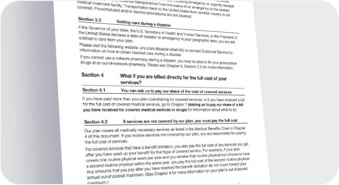 2024 Evidence of Coverage for UnitedHealthcare® Group Medicare Advantage PEBB Balance (PPO) Chapter 3: Using the plan for your medical services 66 Our plan covers worldwide emergency and urgently needed services outside the United States under the following circumstances: emergency services, including emergency or urgently needed care and emergency ambulance transportation from the scene of an emergency to the nearest medical treatment facility. Transportation back to the United States from another country is not covered. Pre-scheduled and/or elective procedures are not covered. Section 3.3 Getting care during a disaster If the Governor of your state, the U.S. Secretary of Health and Human Services, or the President of the United States declares a state of disaster or emergency in your geographic area, you are still entitled to care from your plan. Please visit the following website: uhc.com/disaster-relief-info or contact Customer Service for information on how to obtain needed care during a disaster. If you cannot use a network pharmacy during a disaster, you may be able to fill your prescription drugs at an out-of-network pharmacy. Please see Chapter 5, Section 2.5 for more information. Section 4 What if you are billed directly for the full cost of your services? Section 4.1 You can ask us to pay our share of the cost of covered services If you have paid more than your plan cost-sharing for covered services, or if you have received a bill for the full cost of covered medical services, go to Chapter 7 (Asking us to pay our share of a bill you have received for covered medical services or drugs) for information about what to do. Section 4.2 If services are not covered by our plan, you must pay the full cost Our plan covers all medically necessary services as listed in the Medical Benefits Chart in Chapter 4 of this document. If you receive services not covered by our plan, you are responsible for paying the full cost of services. For covered services that have a benefit limitation, you also pay the full cost of any services you get after you have used up your benefit for that type of covered service. For example, if your plan covers one routine physical exam per year and you receive that routine physical but choose to have a second routine physical within the same year, you pay the full cost of the second routine physical. Any amounts that you pay after you have reached the benefit limitation do not count toward your annual out-of-pocket maximum. (See Chapter 4 for more information on your plan’s out-of-pocket maximum.) Section 5 How are your medical services covered when you are in a “clinical research study”? Section 5.1 What is a “clinical research study”?