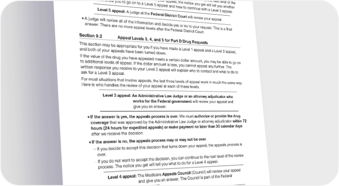 2024 Evidence of Coverage for UnitedHealthcare® Group Medicare Advantage PEBB Balance (PPO) Chapter 9: What to do if you have a problem or complaint (coverage decisions, appeals, complaints) 231 - If you do not want to accept the decision, you may be able to continue to the next level of the review process. If the Council says no to your appeal, the notice you get will tell you whether the rules allow you to go on to a Level 5 appeal and how to continue with a Level 5 appeal. Level 5 appeal: A judge at the Federal District Court will review your appeal. · A judge will review all of the information and decide yes or no to your request. This is a final answer. There are no more appeal levels after the Federal District Court. Section 9.2 Appeal Levels 3, 4, and 5 for Part D Drug Requests This section may be appropriate for you if you have made a Level 1 appeal and a Level 2 appeal, and both of your appeals have been turned down. If the value of the drug you have appealed meets a certain dollar amount, you may be able to go on to additional levels of appeal. If the dollar amount is less, you cannot appeal any further. The written response you receive to your Level 2 appeal will explain who to contact and what to do to ask for a Level 3 appeal. For most situations that involve appeals, the last three levels of appeal work in much the same way. Here is who handles the review of your appeal at each of these levels. Level 3 appeal: An Administrative Law Judge or an attorney adjudicator who works for the Federal government will review your appeal and give you an answer. · If the answer is yes, the appeals process is over. We must authorize or provide the drug coverage that was approved by the Administrative Law Judge or attorney adjudicator within 72 hours (24 hours for expedited appeals) or make payment no later than 30 calendar days after we receive the decision. · If the answer is no, the appeals process may or may not be over. - If you decide to accept this decision that turns down your appeal, the appeals process is over. - If you do not want to accept the decision, you can continue to the next level of the review process. The notice you get will tell you what to do for a Level 4 appeal. Level 4 appeal: The Medicare Appeals Council (Council) will review your appeal and give you an answer. The Council is part of the Federal government. · If the answer is yes, the appeals process is over. We must authorize or provide the drug coverage that was approved by the Council within 72 hours (24 hours for expedited appeals) or make payment no later than 30 calendar days after we receive the decision. · If the answer is no, the appeals process may or may not be over.