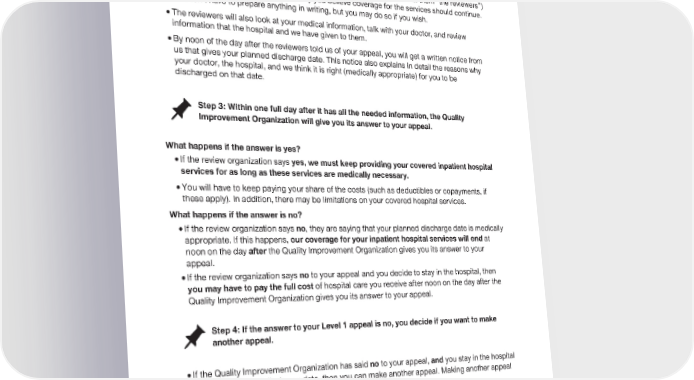 2024 Evidence of Coverage for UnitedHealthcare® Group Medicare Advantage PEBB Balance (PPO) Chapter 9: What to do if you have a problem or complaint (coverage decisions, appeals, complaints) 219 · Health professionals at the Quality Improvement Organization (we will call them “the reviewers”) will ask you (or your representative) why you believe coverage for the services should continue. You don’t have to prepare anything in writing, but you may do so if you wish. · The reviewers will also look at your medical information, talk with your doctor, and review information that the hospital and we have given to them. · By noon of the day after the reviewers told us of your appeal, you will get a written notice from us that gives your planned discharge date. This notice also explains in detail the reasons why your doctor, the hospital, and we think it is right (medically appropriate) for you to be discharged on that date. Step 3: Within one full day after it has all the needed information, the Quality Improvement Organization will give you its answer to your appeal. What happens if the answer is yes? · If the review organization says yes, we must keep providing your covered inpatient hospital services for as long as these services are medically necessary. · You will have to keep paying your share of the costs (such as deductibles or copayments, if these apply). In addition, there may be limitations on your covered hospital services. What happens if the answer is no? · If the review organization says no, they are saying that your planned discharge date is medically appropriate. If this happens, our coverage for your inpatient hospital services will end at noon on the day after the Quality Improvement Organization gives you its answer to your appeal. · If the review organization says no to your appeal and you decide to stay in the hospital, then you may have to pay the full cost of hospital care you receive after noon on the day after the Quality Improvement Organization gives you its answer to your appeal. Step 4: If the answer to your Level 1 appeal is no, you decide if you want to make another appeal. · If the Quality Improvement Organization has said no to your appeal, and you stay in the hospital after your planned discharge date, then you can make another appeal. Making another appeal means you are going on to Level 2 of the appeals process. Section 7.3 Step-by-step: How to make a Level 2 appeal to change your hospital discharge date