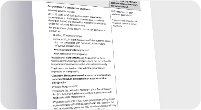 2024 Evidence of Coverage for UnitedHealthcare® Group Medicare Advantage PEBB Balance (PPO) Chapter 4: Medical Benefits Chart (what is covered and what you pay) 77 Services that are covered for you What you must pay when you get these services in-network and out-of-network Acupuncture for chronic low back pain $15 copayment for each Covered services include: Medicare-covered visit. Up to 12 visits in 90 days performed by, or under the You pay these amounts until supervision of a physician (or other medical provider as you reach the out-of-pocket described below) are covered for Medicare beneficiaries maximum. under the following circumstances: For the purpose of this benefit, chronic low back pain is defined as: · Lasting 12 weeks or longer; · nonspecific, in that it has no identifiable systemic cause (i.e., not associated with metastatic, inflammatory, infectious disease, etc.); · not associated with surgery; and · not associated with pregnancy. An additional eight sessions will be covered for those patients demonstrating an improvement. No more than 20 acupuncture treatments may be administered annually. Treatment must be discontinued if the patient is not improving or is regressing. Generally, Medicare-covered acupuncture services are not covered when provided by an acupuncturist or chiropractor. Provider Requirements: Physicians (as defined in 1861(r)(1) of the Social Security Act (the Act) may furnish acupuncture in accordance with applicable state requirements. Physician assistants (PAs), nurse practitioners (NPs)/clinical nurse specialists (CNSs) (as identified in 1861(aa)(5) of the Act), and auxiliary personnel may furnish acupuncture if they meet all applicable state requirements and have: · a masters or doctoral level degree in acupuncture or Oriental Medicine from a school accredited by the