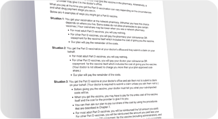 2024 Evidence of Coverage for UnitedHealthcare® Group Medicare Advantage PEBB Balance (PPO) Chapter 6: What you pay for your Part D prescription drugs 172 - The vaccine itself may be dispensed by a pharmacy or provided by the doctor’s office. 3. Who gives you the vaccine. - A pharmacist or another provider may give the vaccine in the pharmacy. Alternatively, a provider may give it in the doctor’s office. What you pay at the time you get the Part D vaccination can vary depending on the circumstances and what drug payment stage you are in. Below are 4 examples of ways you might get a Part D vaccine. Situation 1: You get your vaccination at the network pharmacy. (Whether you have this choice depends on where you live. Some states do not allow pharmacies to give certain vaccines.) Your cost-share may be lower when you use a network pharmacy. · For most adult Part D vaccines, you will pay nothing. · For other Part D vaccines, you will pay the pharmacy your coinsurance OR copayment for the vaccine itself which includes the cost of giving you the vaccine. · Our plan will pay the remainder of the costs. Situation 2: You get the Part D vaccination at your doctor’s office and they submit a claim on your behalf. · For most adult Part D vaccines, you will pay nothing. · For other Part D vaccines, you will pay your doctor your coinsurance OR copayment for the vaccine itself which includes the cost of giving you the vaccine. (Your doctor is not allowed to charge you more than your plan approved cost- share.) · Our plan will pay the remainder of the costs. Situation 3: You get the Part D vaccine at your doctor's office and ask them not to submit a claim on your behalf. (Your doctor is required to submit a claim unless you ask them not to.) · Before giving you the vaccine, your doctor must tell you what your out-of-pocket costs will be. · When you get the vaccine, you may have to pay for the entire cost of the vaccine itself and the cost for the provider to give it to you. · You can then ask our plan to pay our share of the cost by using the procedures that are described in Chapter 7. · For most adult Part D vaccines, you will be reimbursed the full amount you paid. For other Part D vaccines, you will be reimbursed the amount you paid less your normal coinsurance OR copayment for the vaccine (including administration), and less any difference between the amount the doctor charges and what we normally pay. (If you get “Extra Help,” we will reimburse you for this difference.) Situation 4: You buy the Part D vaccine itself at your pharmacy, and then take it to your doctor’s office where they give you the vaccine. · For most adult Part D vaccines, you will pay nothing for the vaccine itself.