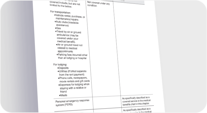 2024 Evidence of Coverage for UnitedHealthcare® Group Medicare Advantage PEBB Balance (PPO) Chapter 4: Medical Benefits Chart (what is covered and what you pay) 136 Services not covered by Not covered under any Covered only under specific Medicare condition conditions For transplants: items not Not covered under any covered include, but are not condition limited to the below. For transportation: · Vehicle rental, purchase, or maintenance/repairs · Auto clubs (roadside assistance) · Gas · Travel by air or ground ambulance (may be covered under your medical benefit). · Air or ground travel not related to medical appointments · Parking fees incurred other than at lodging or hospital For lodging: · Deposits · Utilities (if billed separate from the rent payment) · Phone calls, newspapers, movie rentals and gift cards · Expenses for lodging when staying with a relative or friend · Meals Personal emergency response As specifically described as a system (PERS) covered service in the medical benefits chart in this chapter. Rally Coach™ programs As specifically described as a covered service in the medical benefits chart in this chapter. UnitedHealthcare Healthy at As specifically described as a Home post-discharge program covered service in the medical benefits chart in this chapter.