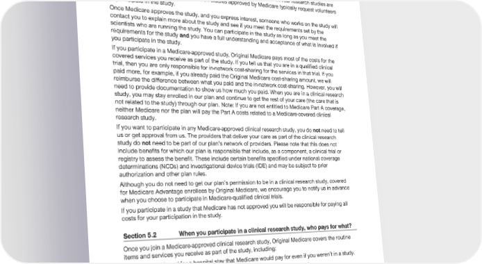 2024 Evidence of Coverage for UnitedHealthcare® Group Medicare Advantage PEBB Balance (PPO) Chapter 3: Using the plan for your medical services 67 A clinical research study (also called a “clinical trial”) is a way that doctors and scientists test new types of medical care, like how well a new cancer drug works. Certain clinical research studies are approved by Medicare. Clinical research studies approved by Medicare typically request volunteers to participate in the study. Once Medicare approves the study, and you express interest, someone who works on the study will contact you to explain more about the study and see if you meet the requirements set by the scientists who are running the study. You can participate in the study as long as you meet the requirements for the study and you have a full understanding and acceptance of what is involved if you participate in the study. If you participate in a Medicare-approved study, Original Medicare pays most of the costs for the covered services you receive as part of the study. If you tell us that you are in a qualified clinical trial, then you are only responsible for in-network cost-sharing for the services in that trial. If you paid more, for example, if you already paid the Original Medicare cost-sharing amount, we will reimburse the difference between what you paid and the in-network cost-sharing. However, you will need to provide documentation to show us how much you paid. When you are in a clinical research study, you may stay enrolled in our plan and continue to get the rest of your care (the care that is not related to the study) through our plan. Note: If you are not entitled to Medicare Part A coverage, neither Medicare nor the plan will pay the Part A costs related to a Medicare-covered clinical research study. If you want to participate in any Medicare-approved clinical research study, you do not need to tell us or get approval from us. The providers that deliver your care as part of the clinical research study do not need to be part of our plan’s network of providers. Please note that this does not include benefits for which our plan is responsible that include, as a component, a clinical trial or registry to assess the benefit. These include certain benefits specified under national coverage determinations (NCDs) and investigational device trials (IDE) and may be subject to prior authorization and other plan rules. Although you do not need to get our plan’s permission to be in a clinical research study, covered for Medicare Advantage enrollees by Original Medicare, we encourage you to notify us in advance when you choose to participate in Medicare-qualified clinical trials. If you participate in a study that Medicare has not approved you will be responsible for paying all costs for your participation in the study. Section 5.2 When you participate in a clinical research study, who pays for what? Once you join a Medicare-approved clinical research study, Original Medicare covers the routine items and services you receive as part of the study, including: · Room and board for a hospital stay that Medicare would pay for even if you weren’t in a study. · An operation or other medical procedure if it is part of the research study. · Treatment of side effects and complications of the new care. Note: If you are not entitled to Medicare Part A coverage, neither Medicare nor the plan will pay the Part A related costs related to a Medicare-covered clinical research study.