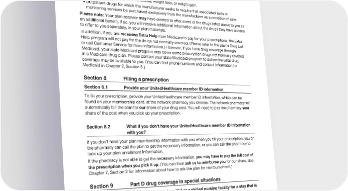 2024 Evidence of Coverage for UnitedHealthcare® Group Medicare Advantage PEBB Balance (PPO) Chapter 5: Using the plan’s coverage for Part D prescription drugs 158 · Prescription vitamins and mineral products, except prenatal vitamins and fluoride preparations. · Drugs used for the treatment of sexual or erectile dysfunction. · Drugs used for treatment of anorexia, weight loss, or weight gain. · Outpatient drugs for which the manufacturer seeks to require that associated tests or monitoring services be purchased exclusively from the manufacturer as a condition of sale. Please note: Your plan sponsor may have elected to offer some of the drugs listed above to you as an additional benefit. If so, you will receive additional information about the drugs they have chosen to offer to you separately, in your plan materials. In addition, if you are receiving Extra Help from Medicare to pay for your prescriptions, the Extra Help program will not pay for the drugs not normally covered. (Please refer to the plan’s Drug List or call Customer Service for more information.) However, if you have drug coverage through Medicaid, your state Medicaid program may cover some prescription drugs not normally covered in a Medicare drug plan. Please contact your state Medicaid program to determine what drug coverage may be available to you. (You can find phone numbers and contact information for Medicaid in Chapter 2, Section 6.) Section 8 Filling a prescription Section 8.1 Provide your UnitedHealthcare member ID information To fill your prescription, provide your UnitedHealthcare member ID information, which can be found on your membership card, at the network pharmacy you choose. The network pharmacy will automatically bill the plan for our share of your drug cost. You will need to pay the pharmacy your share of the cost when you pick up your prescription. Section 8.2 What if you don’t have your UnitedHealthcare member ID information with you? If you don’t have your plan membership information with you when you fill your prescription, you or the pharmacy can call the plan to get the necessary information, or you can ask the pharmacy to look up your plan enrollment information. If the pharmacy is not able to get the necessary information, you may have to pay the full cost of the prescription when you pick it up. (You can then ask us to reimburse you for our share. See Chapter 7, Section 2 for information about how to ask the plan for reimbursement.) Section 9 Part D drug coverage in special situations Section 9.1 What if you’re in a hospital or a skilled nursing facility for a stay that is covered by the plan? If you are admitted to a hospital or to a skilled nursing facility for a stay covered by the plan, we will generally cover the cost of your prescription drugs during your stay. Once you leave the hospital or skilled nursing facility, the plan will cover your prescription drugs as long as the drugs meet all of our rules for coverage described in this Chapter.