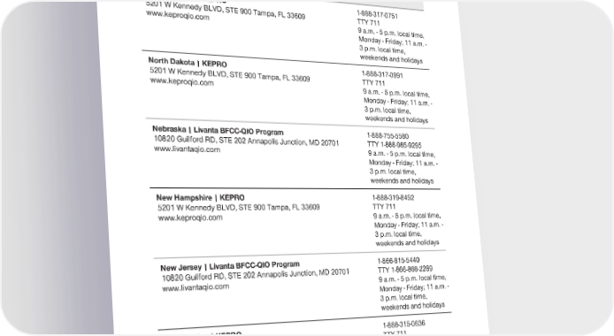 2024 Evidence of Coverage for UnitedHealthcare® Group Medicare Advantage PEBB Balance (PPO) Chapter 2: Important phone numbers and resources 34 Quality Improvement Organization (QIO) – Contact Information North Carolina | KEPRO 1-888-317-0751 5201 W Kennedy BLVD, STE 900 Tampa, FL 33609 TTY 711 www.keproqio.com 9 a.m. - 5 p.m. local time, Monday - Friday; 11 a.m. - 3 p.m. local time, weekends and holidays North Dakota | KEPRO 1-888-317-0891 5201 W Kennedy BLVD, STE 900 Tampa, FL 33609 TTY 711 www.keproqio.com 9 a.m. - 5 p.m. local time, Monday - Friday; 11 a.m. - 3 p.m. local time, weekends and holidays Nebraska | Livanta BFCC-QIO Program 1-888-755-5580 10820 Guilford RD, STE 202 Annapolis Junction, MD 20701 TTY 1-888-985-9295 www.livantaqio.com 9 a.m. - 5 p.m. local time, Monday - Friday; 11 a.m. - 3 p.m. local time, weekends and holidays New Hampshire | KEPRO 1-888-319-8452 5201 W Kennedy BLVD, STE 900 Tampa, FL 33609 TTY 711 www.keproqio.com 9 a.m. - 5 p.m. local time, Monday - Friday; 11 a.m. - 3 p.m. local time, weekends and holidays New Jersey | Livanta BFCC-QIO Program 1-866-815-5440 10820 Guilford RD, STE 202 Annapolis Junction, MD 20701 TTY 1-866-868-2289 www.livantaqio.com 9 a.m. - 5 p.m. local time, Monday - Friday; 11 a.m. - 3 p.m. local time, weekends and holidays New Mexico | KEPRO 1-888-315-0636 5201 W Kennedy BLVD, STE 900 Tampa, FL 33609 TTY 711 www.keproqio.com 9 a.m. - 5 p.m. local time, Monday - Friday; 11 a.m. - 3 p.m. local time, weekends and holidays