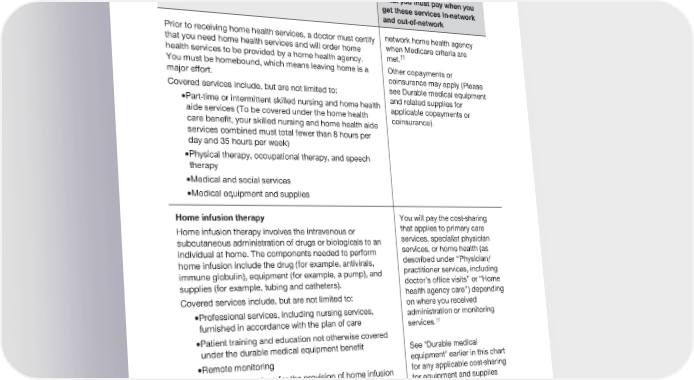 2024 Evidence of Coverage for UnitedHealthcare® Group Medicare Advantage PEBB Balance (PPO) Chapter 4: Medical Benefits Chart (what is covered and what you pay) 93 Services that are covered for you What you must pay when you get these services in-network and out-of-network Prior to receiving home health services, a doctor must certify network home health agency that you need home health services and will order home when Medicare criteria are †† health services to be provided by a home health agency. met. You must be homebound, which means leaving home is a Other copayments or major effort. coinsurance may apply (Please Covered services include, but are not limited to: see Durable medical equipment · Part-time or intermittent skilled nursing and home health and related supplies for aide services (To be covered under the home health applicable copayments or care benefit, your skilled nursing and home health aide coinsurance). services combined must total fewer than 8 hours per day and 35 hours per week) · Physical therapy, occupational therapy, and speech therapy · Medical and social services · Medical equipment and supplies Home infusion therapy You will pay the cost-sharing Home infusion therapy involves the intravenous or that applies to primary care subcutaneous administration of drugs or biologicals to an services, specialist physician individual at home. The components needed to perform services, or home health (as home infusion include the drug (for example, antivirals, described under “Physician/ immune globulin), equipment (for example, a pump), and practitioner services, including supplies (for example, tubing and catheters). doctor’s office visits” or “Home Covered services include, but are not limited to: health agency care”) depending on where you received · Professional services, including nursing services, administration or monitoring furnished in accordance with the plan of care services.†† · Patient training and education not otherwise covered under the durable medical equipment benefit See "Durable medical · Remote monitoring equipment" earlier in this chart · Monitoring services for the provision of home infusion for any applicable cost-sharing therapy and home infusion drugs furnished by a for equipment and supplies qualified home infusion therapy supplier related to home infusion †† therapy.
