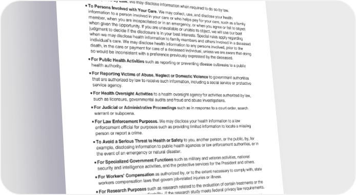 2024 Evidence of Coverage for UnitedHealthcare® Group Medicare Advantage PEBB Balance (PPO) Chapter 8: Your rights and responsibilities 184 We may collect, use, and disclose your health information for the following purposes under limited circumstances: · As Required by Law. We may disclose information when required to do so by law. · To Persons Involved with Your Care. We may collect, use, and disclose your health information to a person involved in your care or who helps pay for your care, such as a family member, when you are incapacitated or in an emergency, or when you agree or fail to object when given the opportunity. If you are unavailable or unable to object, we will use our best judgment to decide if the disclosure is in your best interests. Special rules apply regarding when we may disclose health information to family members and others involved in a deceased individual’s care. We may disclose health information to any persons involved, prior to the death, in the care or payment for care of a deceased individual, unless we are aware that doing so would be inconsistent with a preference previously expressed by the deceased. · For Public Health Activities such as reporting or preventing disease outbreaks to a public health authority. · For Reporting Victims of Abuse, Neglect or Domestic Violence to government authorities that are authorized by law to receive such information, including a social service or protective service agency. · For Health Oversight Activities to a health oversight agency for activities authorized by law, such as licensure, governmental audits and fraud and abuse investigations. · For Judicial or Administrative Proceedings such as in response to a court order, search warrant or subpoena. · For Law Enforcement Purposes. We may disclose your health information to a law enforcement official for purposes such as providing limited information to locate a missing person or report a crime. · To Avoid a Serious Threat to Health or Safety to you, another person, or the public, by, for example, disclosing information to public health agencies or law enforcement authorities, or in the event of an emergency or natural disaster. · For Specialized Government Functions such as military and veteran activities, national security and intelligence activities, and the protective services for the President and others. · For Workers’ Compensation as authorized by, or to the extent necessary to comply with, state workers compensation laws that govern job-related injuries or illness. · For Research Purposes such as research related to the evaluation of certain treatments or the prevention of disease or disability, if the research study meets federal privacy law requirements. · To Provide Information Regarding Decedents. We may disclose information to a coroner or medical examiner to identify a deceased person, determine a cause of death, or as authorized by law. We may also disclose information to funeral directors as necessary to carry out their duties.