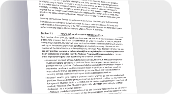 2024 Evidence of Coverage for UnitedHealthcare® Group Medicare Advantage PEBB Balance (PPO) Chapter 3: Using the plan for your medical services 64 What if a specialist or another network provider leaves our plan? It is important that you know that we may make changes to the hospitals, doctors, and specialists (providers) that are part of your plan during the year. If this happens, you may continue to see the provider as long as he/she continues to accept the plan and has not opted out of or been excluded or precluded from the Medicare Program, and the care you receive is a covered service and is medically necessary. Even though our network of providers may change during the year, Medicare requires that we furnish you with uninterrupted access to qualified doctors and specialists. When possible, we will provide you with at least 30 days’ notice that your network provider is leaving our plan. You may call Customer Service for assistance at the number listed in Chapter 2 of this booklet. Some services require prior authorization from the plan in order to be covered. Obtaining prior authorization is the responsibility of the PCP or treating provider. Services and items requiring prior authorization are listed in Medical Benefits Chart in Chapter 4, Section 2.1. Section 2.2 How to get care from out-of-network providers As a member of our plan, you can choose to receive care from out-of-network providers. However, please note providers that do not contract with us are under no obligation to treat you, except in emergency situations. Our plan will cover services from either network or out-of-network providers, as long as the services are covered benefits and are medically necessary. Because you are a member of the UnitedHealthcare® Group Medicare Advantage PEBB Balance (PPO) plan, you can see any provider (network or out-of-network) that accepts the plan and has not opted out of or been excluded or precluded from the Medicare Program, at the same cost share. Here are other important things to know about using out-of-network providers: · You can get your care from an out-of-network provider, however, in most cases that provider must be eligible to participate in Medicare. Except for emergency care, we cannot pay a provider who has opted out of or been excluded or precluded from the Medicare Program. If you receive care from a provider who is not eligible to participate in Medicare, you will be responsible for the full cost of the services you receive. Check with your provider before receiving services to confirm that they are eligible to participate in Medicare. · You don’t need to get a referral or prior authorization when you get care from out-of-network providers. However, before getting services from out-of-network providers you may want to ask for a pre-visit coverage decision to confirm that the services you are getting are covered and are medically necessary. (See Chapter 9, Section 4 for information about asking for coverage decisions.) This is important because: - Without a pre-visit coverage decision, if we later determine that the services are not covered or were not medically necessary, we may deny coverage and you will be responsible for the entire cost. If we say we will not cover your services, you have the right to appeal our decision not to cover your care. See Chapter 9 (What to do if you have a problem or complaint) to learn how to make an appeal. · It is best to ask an out-of-network provider to bill the plan first. But, if you have already paid for the covered services, we will reimburse you for our share of the cost for covered services. Or if an out-of-network provider sends you a bill that you think we should pay, you can send it to us