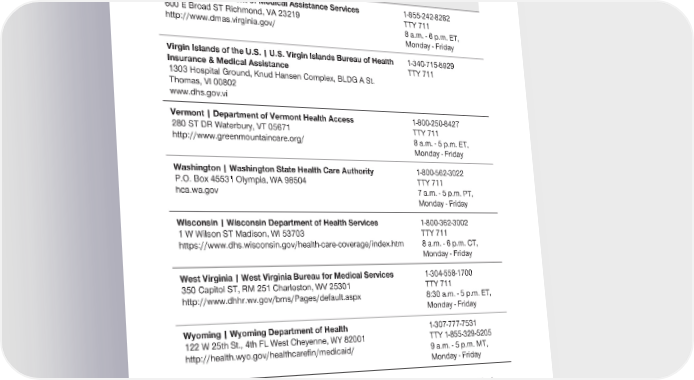 2024 Evidence of Coverage for UnitedHealthcare® Group Medicare Advantage PEBB Balance (PPO) Chapter 2: Important phone numbers and resources 46 State Medicaid Programs – Contact Information Virginia | Department of Medical Assistance Services 1-855-242-8282 600 E Broad ST Richmond, VA 23219 TTY 711 http://www.dmas.virginia.gov/ 8 a.m. - 6 p.m. ET, Monday - Friday Virgin Islands of the U.S. | U.S. Virgin Islands Bureau of Health 1-340-715-6929 Insurance & Medical Assistance TTY 711 1303 Hospital Ground, Knud Hansen Complex, BLDG A St. Thomas, VI 00802 www.dhs.gov.vi Vermont | Department of Vermont Health Access 1-800-250-8427 280 ST DR Waterbury, VT 05671 TTY 711 http://www.greenmountaincare.org/ 8 a.m. - 5 p.m. ET, Monday - Friday Washington | Washington State Health Care Authority 1-800-562-3022 P.O. Box 45531 Olympia, WA 98504 TTY 711 hca.wa.gov 7 a.m. - 5 p.m. PT, Monday - Friday Wisconsin | Wisconsin Department of Health Services 1-800-362-3002 1 W Wilson ST Madison, WI 53703 TTY 711 https://www.dhs.wisconsin.gov/health-care-coverage/index.htm 8 a.m. - 6 p.m. CT, Monday - Friday West Virginia | West Virginia Bureau for Medical Services 1-304-558-1700 350 Capitol ST, RM 251 Charleston, WV 25301 TTY 711 http://www.dhhr.wv.gov/bms/Pages/default.aspx 8:30 a.m. - 5 p.m. ET, Monday - Friday Wyoming | Wyoming Department of Health 1-307-777-7531 122 W 25th St., 4th FL West Cheyenne, WY 82001 TTY 1-855-329-5205 http://health.wyo.gov/healthcarefin/medicaid/ 9 a.m. - 5 p.m. MT, Monday - Friday Section 7 Information about programs to help people pay for their prescription drugs The Medicare.gov website (medicare.gov/drug-coverage-part-d/costs-for-medicare-drug-coverage/ costs-in-the-coverage-gap/5-ways-to-get-help-with-prescription-costs) provides information on how