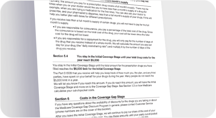 2024 Evidence of Coverage for UnitedHealthcare® Group Medicare Advantage PEBB Balance (PPO) Chapter 6: What you pay for your Part D prescription drugs 170 Section 5.3 If your doctor prescribes less than a full month’s supply, you may not have to pay the cost of the entire month’s supply Typically, the amount you pay for a prescription drug covers a full month’s supply. There may be times when you or your doctor would like you to have less than a month’s supply of a drug (for example, when you are trying a medication for the first time). You can also ask your doctor to prescribe, and your pharmacist to dispense, less than a full month’s supply of your drugs, if this will help you better plan refill dates for different prescriptions. If you receive less than a full month’s supply of certain drugs, you will not have to pay for the full month’s supply. · If you are responsible for coinsurance, you pay a percentage of the total cost of the drug. Since the coinsurance is based on the total cost of the drug, your cost will be lower since the total cost for the drug will be lower. · If you are responsible for a copayment for the drug, you will only pay for the number of days of the drug that you receive instead of a whole month. We will calculate the amount you pay per day for your drug (the “daily cost-sharing rate”) and multiply it by the number of days of the drug you receive. Section 5.4 You stay in the Initial Coverage Stage until your total drug costs for the year reach $5,030 You stay in the Initial Coverage Stage until the total amount for the prescription drugs you have filled reaches the $5,030 limit for the Initial Coverage Stage. The Part D EOB that you receive will help you keep track of how much you, the plan, and any third parties, have spent on your behalf for your drugs during the year. Many people do not reach the $5,030 limit in a year. We will let you know if you reach this amount. If you do reach this amount, you will leave the Initial Coverage Stage and move on to the Coverage Gap Stage. See Section 1.3 on how Medicare calculates your out-of-pocket costs. Section 6 Costs in the Coverage Gap Stage If you have any questions about the availability of discounts for the drugs you are taking or about the Medicare Coverage Gap Discount Program in general, please contact Customer Service (phone numbers are on the cover of this booklet). After you leave the Initial Coverage Stage, we will continue to pay our share of the cost of your drugs and you pay your share of the cost. You pay these amounts until your yearly out-of-pocket costs reach a maximum amount that Medicare has set. In 2024, that amount is $8,000. Medicare has rules about what counts and what does not count toward your out-of-pocket costs (Section 1.3). Coverage Gap Stage coinsurance requirements do not apply to Part D covered insulin products and most adult Part D vaccines.