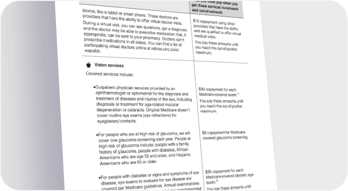 2024 Evidence of Coverage for UnitedHealthcare® Group Medicare Advantage PEBB Balance (PPO) Chapter 4: Medical Benefits Chart (what is covered and what you pay) 128 Services that are covered for you What you must pay when you get these services in-network and out-of-network device, like a tablet or smart phone. These doctors are $15 copayment using other providers that have the ability to offer virtual doctor visits. providers that have the ability During a virtual visit, you can ask questions, get a diagnosis and are qualified to offer virtual and the doctor may be able to prescribe medication that, if medical visits. appropriate, can be sent to your pharmacy. Doctors can’t You pay these amounts until prescribe medications in all states. You can find a list of you reach the out-of-pocket participating virtual doctors online at retiree.uhc.com/ maximum. wapebb. Vision services Covered services include: · Outpatient physician services provided by an $30 copayment for each ophthalmologist or optometrist for the diagnosis and Medicare-covered exam.†† treatment of diseases and injuries of the eye, including You pay these amounts until diagnosis or treatment for age-related macular you reach the out-of-pocket degeneration or cataracts. Original Medicare doesn’t maximum. cover routine eye exams (eye refractions) for eyeglasses/contacts. · For people who are at high risk of glaucoma, we will $0 copayment for Medicare- cover one glaucoma screening each year. People at covered glaucoma screening. high risk of glaucoma include: people with a family history of glaucoma, people with diabetes, African Americans who are age 50 and older, and Hispanic Americans who are 65 or older. · For people with diabetes or signs and symptoms of eye $30 copayment for each disease, eye exams to evaluate for eye disease are Medicare-covered diabetic eye †† covered per Medicare guidelines. Annual examinations exam. by an ophthalmologist or optometrist are recommended You pay these amounts until for asymptomatic diabetics. you reach the out-of-pocket maximum.