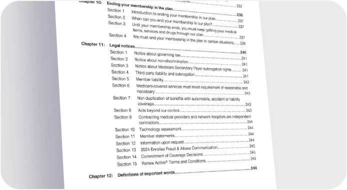 2024 Evidence of Coverage for UnitedHealthcare® Group Medicare Advantage PEBB Balance (PPO) Table of Contents Section 10 How to make a complaint about quality of care, waiting times, customer service, or other concerns....................................................232 Chapter 10: Ending your membership in the plan............................................................... 236 Section 1 Introduction to ending your membership in our plan..........................237 Section 2 When can you end your membership in our plan?............................. 237 Section 3 Until your membership ends, you must keep getting your medical items, services and drugs through our plan.........................................237 Section 4 We must end your membership in the plan in certain situations.......238 Chapter 11: Legal notices....................................................................................................240 Section 1 Notice about governing law...................................................................241 Section 2 Notice about non-discrimination...........................................................241 Section 3 Notice about Medicare Secondary Payer subrogation rights............ 241 Section 4 Third party liability and subrogation..................................................... 241 Section 5 Member liability...................................................................................... 242 Section 6 Medicare-covered services must meet requirement of reasonable and necessary................................................................................................ 243 Section 7 Non duplication of benefits with automobile, accident or liability coverage..................................................................................................243 Section 8 Acts beyond our control........................................................................ 243 Section 9 Contracting medical providers and network hospitals are independent contractors..............................................................................................244 Section 10 Technology assessment........................................................................244 Section 11 Member statements............................................................................... 244 Section 12 Information upon request...................................................................... 244 Section 13 2024 Enrollee Fraud & Abuse Communication................................... 245 Section 14 Commitment of Coverage Decisions....................................................245 Section 15 Renew Active® Terms and Conditions................................................. 245 Chapter 12: Definitions of important words.........................................................................248 QuestionsQuestions?? Call Call CustomCustomer Serviceer Service at at 1-8551-855-873-32-873-326868, TTY , TTY 711711, , 8 a.m.-8 p.m8 a.m.-8 p.m. local time. local time, , Monday-FridayMonday-Friday