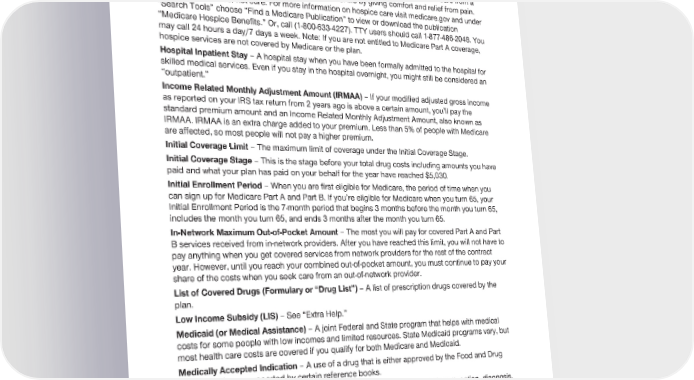 2024 Evidence of Coverage for UnitedHealthcare® Group Medicare Advantage PEBB Balance (PPO) Chapter 12: Definitions of important words 253 who are part of a Medicare-certified public agency or private company. Depending on the situation, this care may be given in the home, a hospice facility, a hospital, or a nursing home. Care from a hospice is meant to help patients in the last months of life by giving comfort and relief from pain. The focus is on care, not cure. For more information on hospice care visit medicare.gov and under “Search Tools” choose “Find a Medicare Publication” to view or download the publication “Medicare Hospice Benefits.” Or, call (1-800-633-4227). TTY users should call 1-877-486-2048. You may call 24 hours a day/7 days a week. Note: If you are not entitled to Medicare Part A coverage, hospice services are not covered by Medicare or the plan. Hospital Inpatient Stay – A hospital stay when you have been formally admitted to the hospital for skilled medical services. Even if you stay in the hospital overnight, you might still be considered an “outpatient.” Income Related Monthly Adjustment Amount (IRMAA) – If your modified adjusted gross income as reported on your IRS tax return from 2 years ago is above a certain amount, you’ll pay the standard premium amount and an Income Related Monthly Adjustment Amount, also known as IRMAA. IRMAA is an extra charge added to your premium. Less than 5% of people with Medicare are affected, so most people will not pay a higher premium. Initial Coverage Limit – The maximum limit of coverage under the Initial Coverage Stage. Initial Coverage Stage – This is the stage before your total drug costs including amounts you have paid and what your plan has paid on your behalf for the year have reached $5,030. Initial Enrollment Period – When you are first eligible for Medicare, the period of time when you can sign up for Medicare Part A and Part B. If you’re eligible for Medicare when you turn 65, your Initial Enrollment Period is the 7-month period that begins 3 months before the month you turn 65, includes the month you turn 65, and ends 3 months after the month you turn 65. In-Network Maximum Out-of-Pocket Amount – The most you will pay for covered Part A and Part B services received from in-network providers. After you have reached this limit, you will not have to pay anything when you get covered services from network providers for the rest of the contract year. However, until you reach your combined out-of-pocket amount, you must continue to pay your share of the costs when you seek care from an out-of-network provider. List of Covered Drugs (Formulary or “Drug List”) – A list of prescription drugs covered by the plan. Low Income Subsidy (LIS) – See “Extra Help.” Medicaid (or Medical Assistance) – A joint Federal and State program that helps with medical costs for some people with low incomes and limited resources. State Medicaid programs vary, but most health care costs are covered if you qualify for both Medicare and Medicaid. Medically Accepted Indication – A use of a drug that is either approved by the Food and Drug Administration or supported by certain reference books. Medically Necessary – Services, supplies, or drugs that are needed for the prevention, diagnosis, or treatment of your medical condition and meet accepted standards of medical practice. Medicare – The Federal health insurance program for people 65 years of age or older, some people under age 65 with certain disabilities, and people with End-Stage Renal Disease (generally those with permanent kidney failure who need dialysis or a kidney transplant).