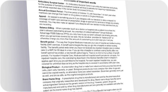 2024 Evidence of Coverage for UnitedHealthcare® Group Medicare Advantage PEBB Balance (PPO) Chapter 12: Definitions of important words 249 Chapter 12 Definitions of important words Ambulatory Surgical Center – An Ambulatory Surgical Center is an entity that operates exclusively for the purpose of furnishing outpatient surgical services to patients not requiring hospitalization and whose expected stay in the center does not exceed 24 hours. Annual Enrollment Period –The time period of October 15 until December 7 of each year when members can change their health or drug plans or switch to Original Medicare. Appeal – An appeal is something you do if you disagree with our decision to deny a request for coverage of health care services or prescription drugs or payment for services or drugs you already received. You may also make an appeal if you disagree with our decision to stop services that you are receiving. Balance Billing – When a provider (such as a doctor or hospital) bills a patient more than the plan’s allowed cost-sharing amount. As a member of UnitedHealthcare® Group Medicare Advantage PEBB Balance (PPO), you only have to pay our plan’s allowed cost-sharing amounts when you get services covered by our plan. We do not allow providers to “balance bill” or otherwise charge you more than the amount of cost-sharing your plan says you must pay. Benefit period – The way that Original Medicare measures your use of hospital and skilled nursing facility (SNF) services. A benefit period begins the day you go into a hospital or skilled nursing facility. The benefit period ends when you have not received any inpatient hospital care (or skilled care in a SNF) for 60 days in a row. If you go into a hospital or a skilled nursing facility after one benefit period has ended, a new benefit period begins. There is no limit to the number of benefit periods. For Inpatient Hospital Care, Medicare-defined hospital benefit periods do not apply. For inpatient hospital care, the cost-sharing described in the Medical Benefits Chart in Chapter 4 applies each time you are admitted to the hospital. For each inpatient hospital stay, you are covered for unlimited days as long as the hospital stay is covered in accordance with plan rules. Biological Product – A prescription drug that is made from natural and living sources like animal cells, plant cells, bacteria, or yeast. Biological products are more complex than other drugs and cannot be copied exactly, so alternative forms are called biosimilars. Biosimilars generally work just as well, and are as safe, as the original biological products. Brand Name Drug – A prescription drug that is manufactured and sold by the pharmaceutical company that originally researched and developed the drug. Brand name drugs have the same active-ingredient formula as the generic version of the drug. However, generic drugs are manufactured and sold by other drug manufacturers and are generally not available until after the patent on the brand name drug has expired. Catastrophic Coverage Stage – The stage in the Part D Drug Benefit that begins when you (or other qualified parties on your behalf) have spent $8,000 for Part D covered drugs during the covered year. During this payment stage, the plan pays the full cost for your covered Part D drugs. You pay nothing. Centers for Medicare & Medicaid Services (CMS) – The Federal agency that administers Medicare.