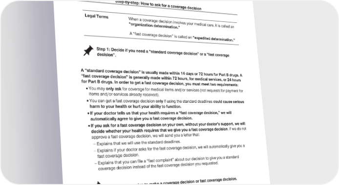 2024 Evidence of Coverage for UnitedHealthcare® Group Medicare Advantage PEBB Balance (PPO) Chapter 9: What to do if you have a problem or complaint (coverage decisions, appeals, complaints) 201 Section 5.2 Step-by-step: How to ask for a coverage decision Legal Terms When a coverage decision involves your medical care, it is called an “organization determination.” A “fast coverage decision” is called an “expedited determination.” Step 1: Decide if you need a “standard coverage decision” or a “fast coverage decision”. A “standard coverage decision” is usually made within 14 days or 72 hours for Part B drugs. A “fast coverage decision” is generally made within 72 hours, for medical services, or 24 hours for Part B drugs. In order to get a fast coverage decision, you must meet two requirements: · You may only ask for coverage for medical items and/or services (not requests for payment for items and/or services already received). · You can get a fast coverage decision only if using the standard deadlines could cause serious harm to your health or hurt your ability to function. · If your doctor tells us that your health requires a “fast coverage decision,” we will automatically agree to give you a fast coverage decision. · If you ask for a fast coverage decision on your own, without your doctor’s support, we will decide whether your health requires that we give you a fast coverage decision. If we do not approve a fast coverage decision, we will send you a letter that: - Explains that we will use the standard deadlines. - Explains if your doctor asks for the fast coverage decision, we will automatically give you a fast coverage decision. - Explains that you can file a “fast complaint” about our decision to give you a standard coverage decision instead of the fast coverage decision you requested. Step 2: Ask our plan to make a coverage decision or fast coverage decision. Start by calling, writing, or faxing our plan to make your request for us to authorize or provide coverage for the medical care you want. You, your doctor, or your representative can do this. Chapter 2 has contact information.