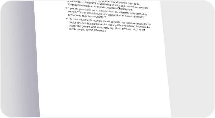 2024 Evidence of Coverage for UnitedHealthcare® Group Medicare Advantage PEBB Balance (PPO) Chapter 6: What you pay for your Part D prescription drugs 173 · For other Part D vaccines, you will have to pay the pharmacy your coinsurance OR copayment for the vaccine itself. · When your doctor gives you the vaccine, they will submit a claim for the administration of the vaccine. Depending on which drug payment stage you're in, you may have to pay an additional coinsurance OR copayment. · If you ask your doctor not to submit a claim, you will pay the entire cost for this service. You can then ask our plan to pay our share of the cost by using the procedures described in Chapter 7. · For most adult Part D vaccines, you will be reimbursed the amount charged by the doctor for administering the vaccine less any difference between the amount the doctor charges and what we normally pay. (If you get “Extra Help,” we will reimburse you for this difference.)