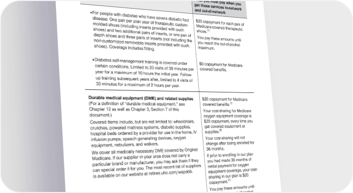 2024 Evidence of Coverage for UnitedHealthcare® Group Medicare Advantage PEBB Balance (PPO) Chapter 4: Medical Benefits Chart (what is covered and what you pay) 86 Services that are covered for you What you must pay when you get these services in-network and out-of-network · For people with diabetes who have severe diabetic foot $20 copayment for each pair of disease: One pair per plan year of therapeutic custom- Medicare-covered therapeutic molded shoes (including inserts provided with such shoes.†† shoes) and two additional pairs of inserts, or one pair of You pay these amounts until depth shoes and three pairs of inserts (not including the you reach the out-of-pocket non-customized removable inserts provided with such maximum. shoes). Coverage includes fitting. · Diabetes self-management training is covered under $0 copayment for Medicare- certain conditions. Limited to 20 visits of 30 minutes per covered benefits. year for a maximum of 10 hours the initial year. Follow- up training subsequent years after, limited to 4 visits of 30 minutes for a maximum of 2 hours per year. Durable medical equipment (DME) and related supplies $20 copayment for Medicare- (For a definition of “durable medical equipment,” see covered benefits.†† Chapter 12 as well as Chapter 3, Section 7 of this Your cost-sharing for Medicare document.) oxygen equipment coverage is Covered items include, but are not limited to: wheelchairs, $20 copayment, every time you crutches, powered mattress systems, diabetic supplies, get covered equipment or †† hospital beds ordered by a provider for use in the home, IV supplies. infusion pumps, speech generating devices, oxygen Your cost-sharing will not equipment, nebulizers, and walkers. change after being enrolled for We cover all medically necessary DME covered by Original 36 months. Medicare. If our supplier in your area does not carry a If prior to enrolling in our plan particular brand or manufacturer, you may ask them if they you had made 36 months of can special order it for you. The most recent list of suppliers rental payment for oxygen is available on our website at retiree.uhc.com/wapebb. equipment coverage, your cost- sharing in our plan is $20 copayment.†† You pay these amounts until you reach the out-of-pocket maximum.