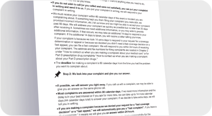 2024 Evidence of Coverage for UnitedHealthcare® Group Medicare Advantage PEBB Balance (PPO) Chapter 9: What to do if you have a problem or complaint (coverage decisions, appeals, complaints) 234 · Usually, calling Customer Service is the first step. If there is anything else you need to do, Customer Service will let you know. · If you do not wish to call (or you called and were not satisfied), you can put your complaint in writing and send it to us. If you put your complaint in writing, we will respond to your complaint in writing. · We must receive your complaint within 60 calendar days of the event or incident you are complaining about. If something kept you from filing your complaint (you were sick, we provided incorrect information, etc.) let us know and we might be able to accept your complaint past 60 days. We will address your complaint as quickly as possible but no later than 30 days after receiving it. Sometimes we need additional information, or you may wish to provide additional information. If that occurs, we may take an additional 14 days to respond to your complaint. If the additional 14 days is taken, you will receive a letter letting you know. If your complaint is because we took 14 extra days to respond to your request for a coverage determination or appeal or because we decided you didn’t need a fast coverage decision or a fast appeal, you can file a fast complaint. We will respond to you within 24 hours of receiving your complaint. The address and fax numbers for filing complaints are located in Chapter 2 under “How to contact us when you are making a complaint about your medical care” or for Part D prescription drug complaints “How to contact us when you are making a complaint about your Part D prescription drugs.” · The deadline for making a complaint is 60 calendar days from the time you had the problem you want to complain about. Step 2: We look into your complaint and give you our answer. · If possible, we will answer you right away. If you call us with a complaint, we may be able to give you an answer on the same phone call. · Most complaints are answered within 30 calendar days. If we need more information and the delay is in your best interest or if you ask for more time, we can take up to 14 more calendar days (44 calendar days total) to answer your complaint. If we decide to take extra days, we will tell you in writing. · If you are making a complaint because we denied your request for a “fast coverage decision” or a “fast appeal,” we will automatically give you a “fast complaint”. If you have a “fast complaint,” it means we will give you an answer within 24 hours. · If we do not agree with some or all of your complaint or don’t take responsibility for the problem you are complaining about, we will include our reasons in our response to you. Section 10.4 You can also make complaints about quality of care to the Quality Improvement Organization When your complaint is about quality of care, you also have two extra options: