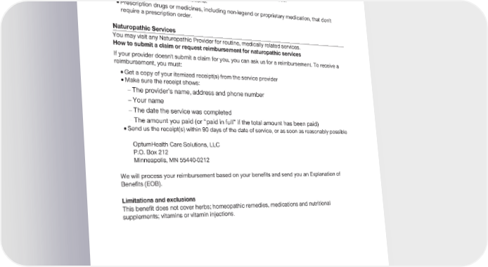 2024 Evidence of Coverage for UnitedHealthcare® Group Medicare Advantage PEBB Balance (PPO) Chapter 4: Medical Benefits Chart (what is covered and what you pay) 144 · Vitamins, minerals, nutritional supplements or other similar-type products. · Acupuncture under anesthesia, hospitalization or any related services. · Intravenous injections or solutions. · Prescription drugs or medicines, including non-legend or proprietary medication, that don't require a prescription order. Naturopathic Services You may visit any Naturopathic Provider for routine, medically related services. How to submit a claim or request reimbursement for naturopathic services If your provider doesn't submit a claim for you, you can ask us for a reimbursement. To receive a reimbursement, you must: · Get a copy of your itemized receipt(s) from the service provider · Make sure the receipt shows: - The provider’s name, address and phone number - Your name - The date the service was completed - The amount you paid (or “paid in full” if the total amount has been paid) · Send us the receipt(s) within 90 days of the date of service, or as soon as reasonably possible OptumHealth Care Solutions, LLC P.O. Box 212 Minneapolis, MN 55440-0212 We will process your reimbursement based on your benefits and send you an Explanation of Benefits (EOB). Limitations and exclusions This benefit does not cover herbs; homeopathic remedies, medications and nutritional supplements; vitamins or vitamin injections.