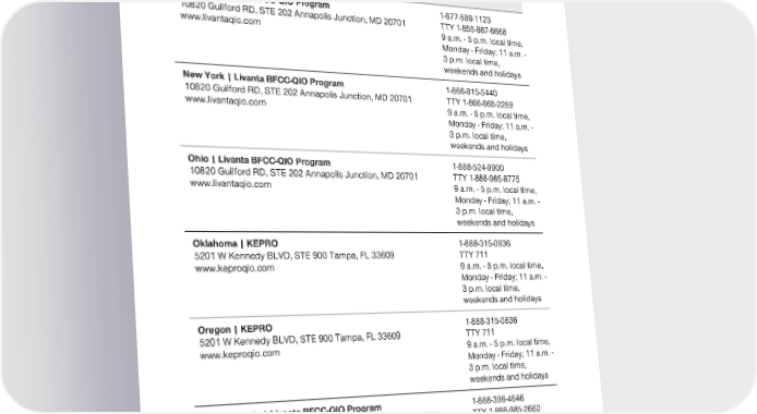 2024 Evidence of Coverage for UnitedHealthcare® Group Medicare Advantage PEBB Balance (PPO) Chapter 2: Important phone numbers and resources 35 Quality Improvement Organization (QIO) – Contact Information Nevada | Livanta BFCC-QIO Program 1-877-588-1123 10820 Guilford RD, STE 202 Annapolis Junction, MD 20701 TTY 1-855-887-6668 www.livantaqio.com 9 a.m. - 5 p.m. local time, Monday - Friday; 11 a.m. - 3 p.m. local time, weekends and holidays New York | Livanta BFCC-QIO Program 1-866-815-5440 10820 Guilford RD, STE 202 Annapolis Junction, MD 20701 TTY 1-866-868-2289 www.livantaqio.com 9 a.m. - 5 p.m. local time, Monday - Friday; 11 a.m. - 3 p.m. local time, weekends and holidays Ohio | Livanta BFCC-QIO Program 1-888-524-9900 10820 Guilford RD, STE 202 Annapolis Junction, MD 20701 TTY 1-888-985-8775 www.livantaqio.com 9 a.m. - 5 p.m. local time, Monday - Friday; 11 a.m. - 3 p.m. local time, weekends and holidays Oklahoma | KEPRO 1-888-315-0636 5201 W Kennedy BLVD, STE 900 Tampa, FL 33609 TTY 711 www.keproqio.com 9 a.m. - 5 p.m. local time, Monday - Friday; 11 a.m. - 3 p.m. local time, weekends and holidays Oregon | KEPRO 1-888-315-0636 5201 W Kennedy BLVD, STE 900 Tampa, FL 33609 TTY 711 www.keproqio.com 9 a.m. - 5 p.m. local time, Monday - Friday; 11 a.m. - 3 p.m. local time, weekends and holidays Pennsylvania | Livanta BFCC-QIO Program 1-888-396-4646 10820 Guilford RD, STE 202 Annapolis Junction, MD 20701 TTY 1-888-985-2660 www.livantaqio.com 9 a.m. - 5 p.m. local time, Monday - Friday; 11 a.m. - 3 p.m. local time, weekends and holidays