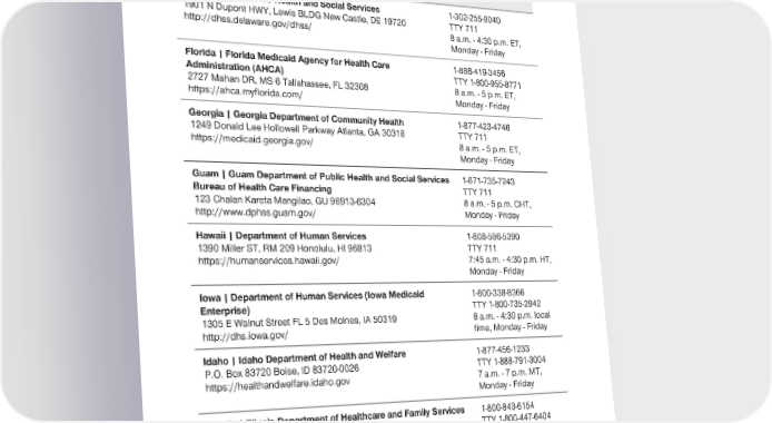 2024 Evidence of Coverage for UnitedHealthcare® Group Medicare Advantage PEBB Balance (PPO) Chapter 2: Important phone numbers and resources 41 State Medicaid Programs – Contact Information Delaware | Delaware Health and Social Services 1-302-255-9040 1901 N Dupont HWY, Lewis BLDG New Castle, DE 19720 TTY 711 http://dhss.delaware.gov/dhss/ 8 a.m. - 4:30 p.m. ET, Monday - Friday Florida | Florida Medicaid Agency for Health Care 1-888-419-3456 Administration (AHCA) TTY 1-800-955-8771 2727 Mahan DR, MS 6 Tallahassee, FL 32308 8 a.m. - 5 p.m. ET, https://ahca.myflorida.com/ Monday - Friday Georgia | Georgia Department of Community Health 1-877-423-4746 1249 Donald Lee Hollowell Parkway Atlanta, GA 30318 TTY 711 https://medicaid.georgia.gov/ 8 a.m. - 5 p.m. ET, Monday - Friday Guam | Guam Department of Public Health and Social Services 1-671-735-7243 Bureau of Health Care Financing TTY 711 123 Chalan Kareta Mangilao, GU 96913-6304 8 a.m. - 5 p.m. CHT, http://www.dphss.guam.gov/ Monday - Friday Hawaii | Department of Human Services 1-808-586-5390 1390 Miller ST, RM 209 Honolulu, HI 96813 TTY 711 https://humanservices.hawaii.gov/ 7:45 a.m. - 4:30 p.m. HT, Monday - Friday Iowa | Department of Human Services (Iowa Medicaid 1-800-338-8366 Enterprise) TTY 1-800-735-2942 1305 E Walnut Street FL 5 Des Moines, IA 50319 8 a.m. - 4:30 p.m. local http://dhs.iowa.gov/ time, Monday - Friday Idaho | Idaho Department of Health and Welfare 1-877-456-1233 P.O. Box 83720 Boise, ID 83720-0026 TTY 1-888-791-3004 https://healthandwelfare.idaho.gov 7 a.m. - 7 p.m. MT, Monday - Friday Illinois | Illinois Department of Healthcare and Family Services 1-800-843-6154 100 S Grand AVE E Springfield, IL 62704 TTY 1-800-447-6404 http://www2.illinois.gov/hfs/ 8:30 a.m. - 7 p.m. CT, Monday - Friday