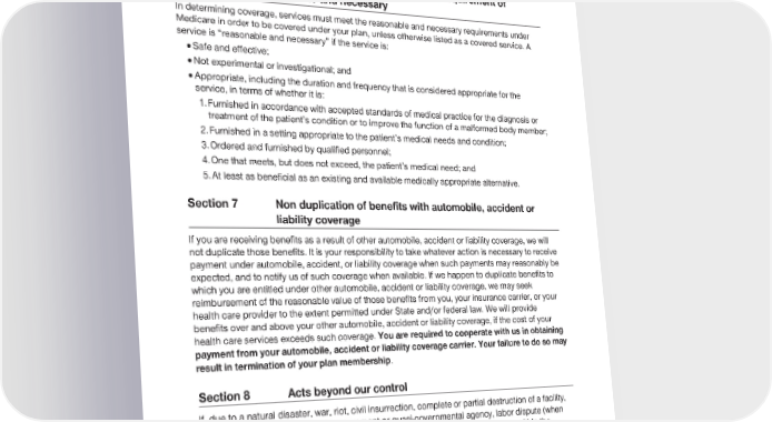 2024 Evidence of Coverage for UnitedHealthcare® Group Medicare Advantage PEBB Balance (PPO) Chapter 11: Legal notices 243 Section 6 Medicare-covered services must meet requirement of reasonable and necessary In determining coverage, services must meet the reasonable and necessary requirements under Medicare in order to be covered under your plan, unless otherwise listed as a covered service. A service is “reasonable and necessary” if the service is: · Safe and effective; · Not experimental or investigational; and · Appropriate, including the duration and frequency that is considered appropriate for the service, in terms of whether it is: 1. Furnished in accordance with accepted standards of medical practice for the diagnosis or treatment of the patient’s condition or to improve the function of a malformed body member; 2. Furnished in a setting appropriate to the patient’s medical needs and condition; 3. Ordered and furnished by qualified personnel; 4. One that meets, but does not exceed, the patient’s medical need; and 5. At least as beneficial as an existing and available medically appropriate alternative. Section 7 Non duplication of benefits with automobile, accident or liability coverage If you are receiving benefits as a result of other automobile, accident or liability coverage, we will not duplicate those benefits. It is your responsibility to take whatever action is necessary to receive payment under automobile, accident, or liability coverage when such payments may reasonably be expected, and to notify us of such coverage when available. If we happen to duplicate benefits to which you are entitled under other automobile, accident or liability coverage, we may seek reimbursement of the reasonable value of those benefits from you, your insurance carrier, or your health care provider to the extent permitted under State and/or federal law. We will provide benefits over and above your other automobile, accident or liability coverage, if the cost of your health care services exceeds such coverage. You are required to cooperate with us in obtaining payment from your automobile, accident or liability coverage carrier. Your failure to do so may result in termination of your plan membership. Section 8 Acts beyond our control If, due to a natural disaster, war, riot, civil insurrection, complete or partial destruction of a facility, ordinance, law or decree of any government or quasi-governmental agency, labor dispute (when said dispute is not within our control), or any other emergency or similar event not within the control of us, providers may become unavailable to arrange or provide health services pursuant to this Evidence of Coverage and Disclosure Information, then we shall attempt to arrange for covered services insofar as practical and according to our best judgment. Neither we nor any provider shall have any liability or obligation for delay or failure to provide or arrange for covered services if such delay is the result of any of the circumstances described above.