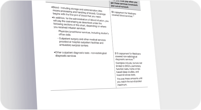 2024 Evidence of Coverage for UnitedHealthcare® Group Medicare Advantage PEBB Balance (PPO) Chapter 4: Medical Benefits Chart (what is covered and what you pay) 106 Services that are covered for you What you must pay when you get these services in-network and out-of-network · Blood - including storage and administration (this $0 copayment for Medicare- †† means processing and handling of blood). Coverage covered blood services. begins with the first pint of blood that you need. · In addition, for the administration of blood infusion, you will pay the cost-sharing as described under the following sections of this chart, depending on where you received infusion services: - Physician/practitioner services, including doctor’s office visits - Outpatient surgery and other medical services provided at hospital outpatient facilities and ambulatory surgical centers · Other outpatient diagnostic tests - non-radiological $15 copayment for Medicare- diagnostic services covered non-radiological diagnostic services.†† Examples include, but are not limited to EKG’s, pulmonary function tests, home or lab- based sleep studies, and treadmill stress tests. You pay these amounts until you reach the out-of-pocket maximum.