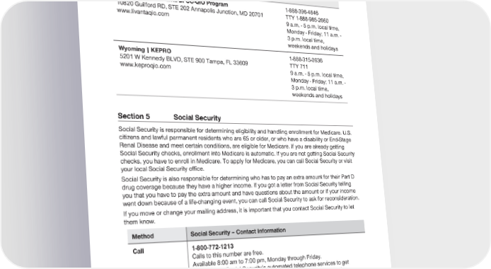 2024 Evidence of Coverage for UnitedHealthcare® Group Medicare Advantage PEBB Balance (PPO) Chapter 2: Important phone numbers and resources 38 Quality Improvement Organization (QIO) – Contact Information West Virginia | Livanta BFCC-QIO Program 1-888-396-4646 10820 Guilford RD, STE 202 Annapolis Junction, MD 20701 TTY 1-888-985-2660 www.livantaqio.com 9 a.m. - 5 p.m. local time, Monday - Friday; 11 a.m. - 3 p.m. local time, weekends and holidays Wyoming | KEPRO 1-888-315-0636 5201 W Kennedy BLVD, STE 900 Tampa, FL 33609 TTY 711 www.keproqio.com 9 a.m. - 5 p.m. local time, Monday - Friday; 11 a.m. - 3 p.m. local time, weekends and holidays Section 5 Social Security Social Security is responsible for determining eligibility and handling enrollment for Medicare. U.S. citizens and lawful permanent residents who are 65 or older, or who have a disability or End-Stage Renal Disease and meet certain conditions, are eligible for Medicare. If you are already getting Social Security checks, enrollment into Medicare is automatic. If you are not getting Social Security checks, you have to enroll in Medicare. To apply for Medicare, you can call Social Security or visit your local Social Security office. Social Security is also responsible for determining who has to pay an extra amount for their Part D drug coverage because they have a higher income. If you got a letter from Social Security telling you that you have to pay the extra amount and have questions about the amount or if your income went down because of a life-changing event, you can call Social Security to ask for reconsideration. If you move or change your mailing address, it is important that you contact Social Security to let them know. Method Social Security – Contact Information Call 1-800-772-1213 Calls to this number are free. Available 8:00 am to 7:00 pm, Monday through Friday. You can use Social Security’s automated telephone services to get recorded information and conduct some business 24 hours a day. TTY 1-800-325-0778 This number requires special telephone equipment and is only for people who have difficulties with hearing or speaking.