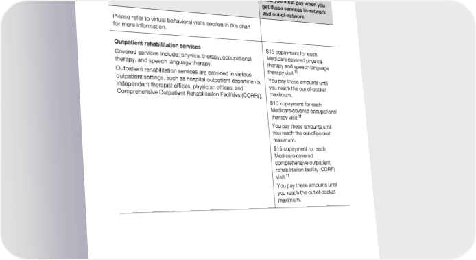 2024 Evidence of Coverage for UnitedHealthcare® Group Medicare Advantage PEBB Balance (PPO) Chapter 4: Medical Benefits Chart (what is covered and what you pay) 112 Services that are covered for you What you must pay when you get these services in-network and out-of-network Please refer to virtual behavioral visits section in this chart for more information. Outpatient rehabilitation services $15 copayment for each Covered services include: physical therapy, occupational Medicare-covered physical therapy, and speech language therapy. therapy and speech-language therapy visit.†† Outpatient rehabilitation services are provided in various outpatient settings, such as hospital outpatient departments, You pay these amounts until independent therapist offices, physician offices, and you reach the out-of-pocket Comprehensive Outpatient Rehabilitation Facilities (CORFs). maximum. $15 copayment for each Medicare-covered occupational therapy visit.†† You pay these amounts until you reach the out-of-pocket maximum. $15 copayment for each Medicare-covered comprehensive outpatient rehabilitation facility (CORF) visit.†† You pay these amounts until you reach the out-of-pocket maximum.