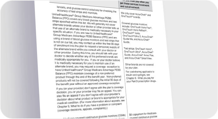 2024 Evidence of Coverage for UnitedHealthcare® Group Medicare Advantage PEBB Balance (PPO) Chapter 4: Medical Benefits Chart (what is covered and what you pay) 85 Services that are covered for you What you must pay when you get these services in-network and out-of-network lancets, and glucose-control solutions for checking the We only cover Accu-Chek® and accuracy of test strips and monitors. OneTouch® brands. UnitedHealthcare® Group Medicare Advantage PEBB Balance (PPO) covers any blood glucose monitors and test Covered glucose monitors strips specified within this list. We will generally not cover include: OneTouch Verio Flex®, alternate brands unless your doctor or other provider tells us OneTouch Verio Reflect®, that use of an alternate brand is medically necessary in your OneTouch® Verio, specific situation. If you are new to UnitedHealthcare® OneTouch®Ultra 2, Accu-Chek® Group Medicare Advantage PEBB Balance (PPO) and are Guide Me, and Accu-Chek® using a brand of blood glucose monitors and test strips that Guide. is not on our list, you may contact us within the first 90 days of enrollment into the plan to request a temporary supply of Test strips: OneTouch Verio®, the alternate brand while you consult with your doctor or OneTouch Ultra®, Accu-Chek® other provider. During this time, you should talk with your Guide, Accu-Chek® Aviva Plus, doctor to decide whether any of the preferred brands are and Accu-Chek® SmartView. medically appropriate for you. If you or your doctor believe it is medically necessary for you to maintain use of an Other brands are not covered alternate brand, you may request a coverage exception to by your plan. have UnitedHealthcare® Group Medicare Advantage PEBB For cost-sharing applicable to Balance (PPO) maintain coverage of a non-preferred insulin and syringes, see product through the end of the benefit year. Non-preferred Chapter 6 - What you pay for products will not be covered following the initial 90 days of your Part D prescription drugs. the benefit year without an approved coverage exception. If you (or your provider) don’t agree with the plan’s coverage decision, you or your provider may file an appeal. You can also file an appeal if you don’t agree with your provider’s decision about what product or brand is appropriate for your medical condition. (For more information about appeals, see Chapter 9, What to do if you have a problem or complaint (coverage decisions, appeals, complaints).) · Medicare-covered continuous glucose monitors (CGMs) $0 copayment for Medicare- and supplies are covered in accordance with Medicare covered continuous glucose Guidelines. monitors (CGMs) and †† supplies.