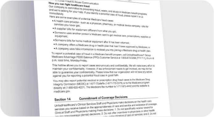 2024 Evidence of Coverage for UnitedHealthcare® Group Medicare Advantage PEBB Balance (PPO) Chapter 11: Legal notices 245 Section 13 2024 Enrollee Fraud & Abuse Communication 2024 Enrollee Fraud & Abuse Communication How you can fight healthcare fraud Our company is committed to preventing fraud, waste, and abuse in Medicare benefit programs and we’re asking for your help. If you identify a potential case of fraud, please report it to us immediately. Here are some examples of potential Medicare fraud cases: · A health care provider - such as a physician, pharmacy, or medical device company - bills for services you never got; · A supplier bills for equipment different from what you got; · Someone uses another person’s Medicare card to get medical care, prescriptions, supplies or equipment; · Someone bills for home medical equipment after it has been returned; · A company offers a Medicare drug or health plan that hasn’t been approved by Medicare; or · A company uses false information to mislead you into joining a Medicare drug or health plan. To report a potential case of fraud in a Medicare benefit program, call UnitedHealthcare® Group Medicare Advantage PEBB Balance (PPO) Customer Service at 1-855-873-3268 (TTY 711), 8 a.m.-8 p.m. local time, Monday-Friday. This hotline allows you to report cases anonymously and confidentially. We will make every effort to maintain your confidentiality. However, if law enforcement needs to get involved, we may not be able to guarantee your confidentiality. Please know that our organization will not take any action against you for reporting a potential fraud case in good faith. You may also report potential medical or prescription drug fraud cases to the Medicare Drug Integrity Contractor (MEDIC) at 1-877-7SafeRx (1-877-772-3379) or to the Medicare program directly at (1-800-633-4227). The Medicare fax number is 1-717-975-4442 and the website is medicare.gov. Section 14 Commitment of Coverage Decisions UnitedHealthcare’s Clinical Services Staff and Physicians make decisions on the health care services you receive based on the appropriateness of care and service and existence of coverage. Clinical Staff and Physicians making these decisions: 1. Do not specifically receive reward for issuing non-coverage (denial) decisions; 2. Do not offer incentives to physicians or other health care professionals to encourage inappropriate underutilization of care or services; and 3. Do not hire, promote, or terminate physicians or other individuals based upon the likelihood or the perceived likelihood that the individual will support or tend to support the denial of benefits. Section 15 Renew Active®Terms and Conditions