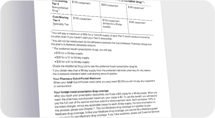 2024 Evidence of Coverage for UnitedHealthcare® Group Medicare Advantage PEBB Balance (PPO) Chapter 6: What you pay for your Part D prescription drugs 169 Your share of the cost when you get a covered Part D prescription drug**: Cost-Sharing $100 copayment $200 copayment $100 copayment* Tier 3 Non-preferred 1 Drug Cost-Sharing $100 copayment $100 copayment $100 copayment* Tier 4 (limited to a 30-day Specialty Tier supply) 1 1 You will pay a maximum of $35 for a 1-month supply of each Part D insulin product covered by our plan even if you haven’t paid your Part D deductible. *You will not be reimbursed for the difference between the Out-of-Network Pharmacy charge and the plan’s In-Network allowable amount. **For preferred insulin prescription drugs, you will pay: · $10 for a 30-day supply · $20 for a 31 to 60-day supply · $30 for a 61 to 90-day supply Check the Additional Drug List to see the preferred insulin prescription drug list. If you obtain less than a 90-day supply from the preferred mail-order pharmacy for any reason, the in-network standard retail cost-sharing amount applies. Your Pharmacy Out-of-Pocket Maximum When your total Out-of-Pocket costs (what you pay) reach $2,000 you will not pay any copayment or coinsurance. Your foreign travel prescription drug coverage After you reach your prescription deductible, you’ll pay a $45 copay for a 30-day supply. When you reach the pharmacy out-of-pocket maximum, your copay is $0. To use this benefit, you will need to pay the full cost of the service and then submit a reimbursement claim. We’ll reimburse 100% of the billed charges, minus any applicable copay for each 30-day supply. For more information on this process, please see Chapter 7. This non-Medicare drug coverage is in addition to your Medicare drug coverage. Unlike your Medicare drug coverage, you cannot file a Medicare appeal or grievance for non-Medicare drug coverage. If you have questions, please call Customer Services using the information on the cover of this booklet. Please see Section 9 of this chapter for more information on Part D vaccines and cost sharing for Part D vaccines.