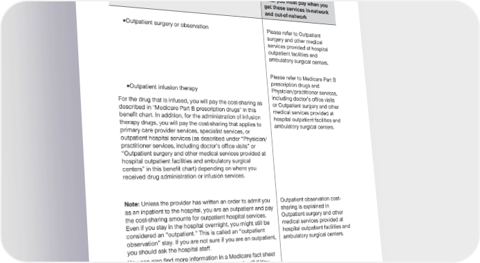 2024 Evidence of Coverage for UnitedHealthcare® Group Medicare Advantage PEBB Balance (PPO) Chapter 4: Medical Benefits Chart (what is covered and what you pay) 110 Services that are covered for you What you must pay when you get these services in-network and out-of-network · Outpatient surgery or observation Please refer to Outpatient surgery and other medical services provided at hospital outpatient facilities and ambulatory surgical centers. Please refer to Medicare Part B prescription drugs and · Outpatient infusion therapy Physician/practitioner services, including doctor’s office visits For the drug that is infused, you will pay the cost-sharing as or Outpatient surgery and other described in "Medicare Part B prescription drugs" in this medical services provided at benefit chart. In addition, for the administration of infusion hospital outpatient facilities and therapy drugs, you will pay the cost-sharing that applies to ambulatory surgical centers. primary care provider services, specialist services, or outpatient hospital services (as described under “Physician/ practitioner services, including doctor’s office visits” or “Outpatient surgery and other medical services provided at hospital outpatient facilities and ambulatory surgical centers” in this benefit chart) depending on where you received drug administration or infusion services. Note: Unless the provider has written an order to admit you Outpatient observation cost- as an inpatient to the hospital, you are an outpatient and pay sharing is explained in the cost-sharing amounts for outpatient hospital services. Outpatient surgery and other Even if you stay in the hospital overnight, you might still be medical services provided at considered an “outpatient.” This is called an “outpatient hospital outpatient facilities and observation” stay. If you are not sure if you are an outpatient, ambulatory surgical centers. you should ask the hospital staff. You can also find more information in a Medicare fact sheet called “Are You a Hospital Inpatient or Outpatient? If You Have Medicare – Ask!” This fact sheet is available on the Web at medicare.gov/sites/default/files/2021-10/11435-