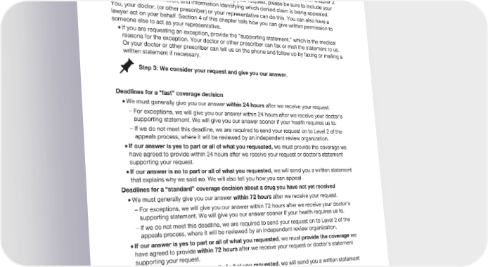 2024 Evidence of Coverage for UnitedHealthcare® Group Medicare Advantage PEBB Balance (PPO) Chapter 9: What to do if you have a problem or complaint (coverage decisions, appeals, complaints) 211 CMS Model Coverage Determination Request Form, which is available on our website. Chapter 2 has contact information. To assist us in processing your request, please be sure to include your name, contact information, and information identifying which denied claim is being appealed. You, your doctor, (or other prescriber) or your representative can do this. You can also have a lawyer act on your behalf. Section 4 of this chapter tells how you can give written permission to someone else to act as your representative. · If you are requesting an exception, provide the “supporting statement,” which is the medical reasons for the exception. Your doctor or other prescriber can fax or mail the statement to us. Or your doctor or other prescriber can tell us on the phone and follow up by faxing or mailing a written statement if necessary. Step 3: We consider your request and give you our answer. Deadlines for a “fast” coverage decision · We must generally give you our answer within 24 hours after we receive your request. - For exceptions, we will give you our answer within 24 hours after we receive your doctor’s supporting statement. We will give you our answer sooner if your health requires us to. - If we do not meet this deadline, we are required to send your request on to Level 2 of the appeals process, where it will be reviewed by an independent review organization. · If our answer is yes to part or all of what you requested, we must provide the coverage we have agreed to provide within 24 hours after we receive your request or doctor’s statement supporting your request. · If our answer is no to part or all of what you requested, we will send you a written statement that explains why we said no. We will also tell you how you can appeal. Deadlines for a “standard” coverage decision about a drug you have not yet received · We must generally give you our answer within 72 hours after we receive your request. - For exceptions, we will give you our answer within 72 hours after we receive your doctor’s supporting statement. We will give you our answer sooner if your health requires us to. - If we do not meet this deadline, we are required to send your request on to Level 2 of the appeals process, where it will be reviewed by an independent review organization. · If our answer is yes to part or all of what you requested, we must provide the coverage we have agreed to provide within 72 hours after we receive your request or doctor’s statement supporting your request. · If our answer is no to part or all of what you requested, we will send you a written statement that explains why we said no. We will also tell you how you can appeal. Deadlines for a “standard” coverage decision about payment for a drug you have already bought · We must give you our answer within 14 calendar days after we receive your request.