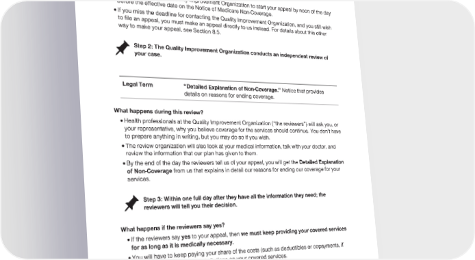 2024 Evidence of Coverage for UnitedHealthcare® Group Medicare Advantage PEBB Balance (PPO) Chapter 9: What to do if you have a problem or complaint (coverage decisions, appeals, complaints) 225 Act quickly: · You must contact the Quality Improvement Organization to start your appeal by noon of the day before the effective date on the Notice of Medicare Non-Coverage. · If you miss the deadline for contacting the Quality Improvement Organization, and you still wish to file an appeal, you must make an appeal directly to us instead. For details about this other way to make your appeal, see Section 8.5. Step 2: The Quality Improvement Organization conducts an independent review of your case. Legal Term “Detailed Explanation of Non-Coverage.” Notice that provides details on reasons for ending coverage. What happens during this review? · Health professionals at the Quality Improvement Organization (“the reviewers”) will ask you, or your representative, why you believe coverage for the services should continue. You don’t have to prepare anything in writing, but you may do so if you wish. · The review organization will also look at your medical information, talk with your doctor, and review the information that our plan has given to them. · By the end of the day the reviewers tell us of your appeal, you will get the Detailed Explanation of Non-Coverage from us that explains in detail our reasons for ending our coverage for your services. Step 3: Within one full day after they have all the information they need; the reviewers will tell you their decision. What happens if the reviewers say yes? · If the reviewers say yes to your appeal, then we must keep providing your covered services for as long as it is medically necessary. · You will have to keep paying your share of the costs (such as deductibles or copayments, if these apply). There may be limitations on your covered services. What happens if the reviewers say no? · If the reviewers say no, then your coverage will end on the date we have told you. · If you decide to keep getting the home health care, or skilled nursing facility care, or Comprehensive Outpatient Rehabilitation Facility (CORF) services after this date when your coverage ends, then you will have to pay the full cost of this care yourself.