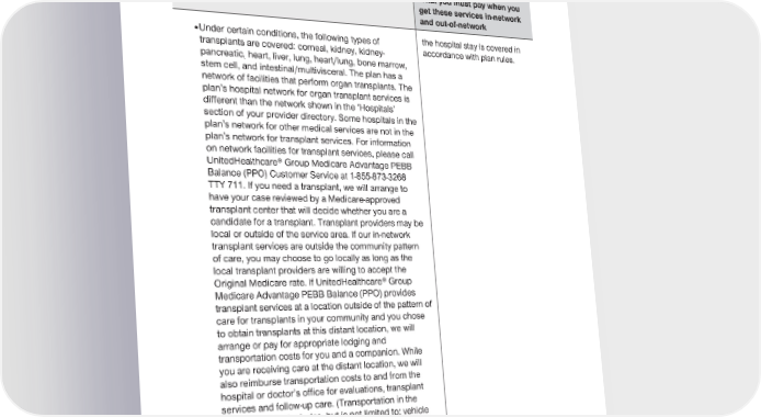 2024 Evidence of Coverage for UnitedHealthcare® Group Medicare Advantage PEBB Balance (PPO) Chapter 4: Medical Benefits Chart (what is covered and what you pay) 97 Services that are covered for you What you must pay when you get these services in-network and out-of-network · Under certain conditions, the following types of the hospital stay is covered in transplants are covered: corneal, kidney, kidney- accordance with plan rules. pancreatic, heart, liver, lung, heart/lung, bone marrow, stem cell, and intestinal/multivisceral. The plan has a network of facilities that perform organ transplants. The plan’s hospital network for organ transplant services is different than the network shown in the ‘Hospitals’ section of your provider directory. Some hospitals in the plan’s network for other medical services are not in the plan’s network for transplant services. For information on network facilities for transplant services, please call UnitedHealthcare® Group Medicare Advantage PEBB Balance (PPO) Customer Service at 1-855-873-3268 TTY 711. If you need a transplant, we will arrange to have your case reviewed by a Medicare-approved transplant center that will decide whether you are a candidate for a transplant. Transplant providers may be local or outside of the service area. If our in-network transplant services are outside the community pattern of care, you may choose to go locally as long as the local transplant providers are willing to accept the Original Medicare rate. If UnitedHealthcare® Group Medicare Advantage PEBB Balance (PPO) provides transplant services at a location outside of the pattern of care for transplants in your community and you chose to obtain transplants at this distant location, we will arrange or pay for appropriate lodging and transportation costs for you and a companion. While you are receiving care at the distant location, we will also reimburse transportation costs to and from the hospital or doctor’s office for evaluations, transplant services and follow-up care. (Transportation in the distant location includes, but is not limited to: vehicle mileage, economy/coach airfare, taxi fares, or rideshare services.) Costs for lodging or places to stay such as hotels, motels or short-term housing as a result of travel