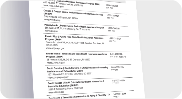 2024 Evidence of Coverage for UnitedHealthcare® Group Medicare Advantage PEBB Balance (PPO) Chapter 2: Important phone numbers and resources 25 State Health Insurance Assistance Programs (SHIP) - Contact Information Oklahoma | Oklahoma Medicare Assistance Program (MAP) 1-800-763-2828 400 NE 50th ST Oklahoma City, OK 73105 TTY 711 www.map.oid.ok.gov Oregon | Oregon Senior Health Insurance Benefits Assistance 1-800-722-4134 (SHIBA) TTY 711 350 Winter St NE Salem, OR 97309 oregonshiba.org Pennsylvania | Pennsylvania Senior Health Insurance Program 1-800-783-7067 555 Walnut ST, FL 5 Harrisburg, PA 17101-1919 TTY 711 aging.pa.gov Puerto Rico | Puerto Rico State Health Insurance Assistance 1-787-721-6121 Program (SHIP) TTY 711 Ponce de León AVE, PDA 16, EDIF 1064, 3er nivel San Juan, PR 00919-1179 www.oppea.pr.gov Rhode Island | Rhode Island State Health Insurance Assistance 1-401-462-3000 Program (SHIP) TTY 1-401-462-0740 25 Howard AVE, BLDG 57 Cranston, RI 02920 https://oha.ri.gov/ South Carolina | South Carolina (I-CARE) Insurance Counseling 1-800-868-9095 Assistance and Referrals for Elders TTY 711 1301 Gervais ST, STE 350 Columbia, SC 29201 https://aging.sc.gov/ South Dakota | South Dakota Senior Health Information & 1-877-331-4834 Insurance Education (SHIINE) TTY 711 2520 E Franklin St Pierre, SD 57501 www.shiine.net Tennessee | Tennessee Commission on Aging & Disability - TN 1-877-801-0044 SHIP TTY 711 Andrew Jackson BLDG, 502 Deaderick ST, FL 9 Nashville, TN 37243-0860 www.tn.gov/aging/our-programs/state-health-insurance- assistance-program--ship-.html