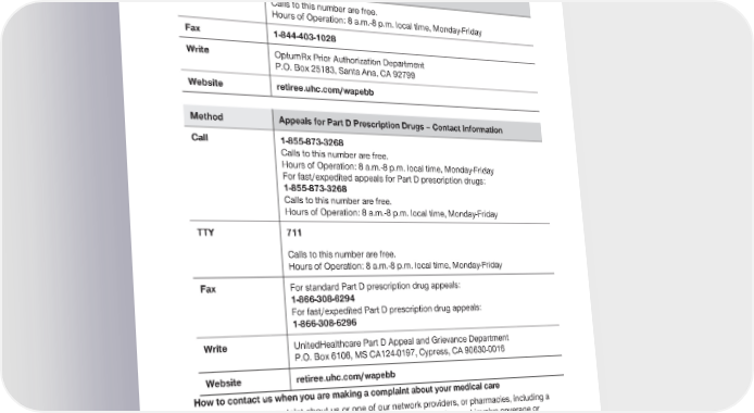 2024 Evidence of Coverage for UnitedHealthcare® Group Medicare Advantage PEBB Balance (PPO) Chapter 2: Important phone numbers and resources 14 Method Coverage Decisions for Part D Prescription Drugs – Contact Information Calls to this number are free. Hours of Operation: 8 a.m.-8 p.m. local time, Monday-Friday Fax 1-844-403-1028 Write OptumRx Prior Authorization Department P.O. Box 25183, Santa Ana, CA 92799 Website retiree.uhc.com/wapebb Method Appeals for Part D Prescription Drugs – Contact Information Call 1-855-873-3268 Calls to this number are free. Hours of Operation: 8 a.m.-8 p.m. local time, Monday-Friday For fast/expedited appeals for Part D prescription drugs: 1-855-873-3268 Calls to this number are free. Hours of Operation: 8 a.m.-8 p.m. local time, Monday-Friday TTY 711 Calls to this number are free. Hours of Operation: 8 a.m.-8 p.m. local time, Monday-Friday Fax For standard Part D prescription drug appeals: 1-866-308-6294 For fast/expedited Part D prescription drug appeals: 1-866-308-6296 Write UnitedHealthcare Part D Appeal and Grievance Department P.O. Box 6106, MS CA124-0197, Cypress, CA 90630-0016 Website retiree.uhc.com/wapebb How to contact us when you are making a complaint about your medical care You can make a complaint about us or one of our network providers, or pharmacies, including a complaint about the quality of your care. This type of complaint does not involve coverage or payment disputes. For more information on making a complaint about your medical care, see Chapter 9 (What to do if you have a problem or complaint (coverage decisions, appeals, complaints)).