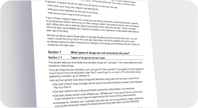 2024 Evidence of Coverage for UnitedHealthcare® Group Medicare Advantage PEBB Balance (PPO) Chapter 5: Using the plan’s coverage for Part D prescription drugs 157 We may make certain changes to the Drug List that are not described above. In these cases, the change will not apply to you if you are taking the drug when the change is made; however, these changes will likely affect you starting January 1 of the next plan year if you stay in the same plan. In general, changes that will not affect you during the current plan year are: · We move your drug into a higher cost-sharing tier. · We put a new restriction on the use of your drug. · We remove your drug from the Drug List. If any of these changes happen for a drug you are taking (except for market withdrawal, a generic drug replacing a brand name drug, or other change noted in the sections above), then the change won’t affect your use or what you pay as your share of the cost until January 1 of the next year. Until that date, you probably won’t see any increase in your payments or any added restrictions to your use of the drug. We will not tell you about these types of changes directly during the current plan year. You will need to check the Drug List for the next plan year (when the list is available during the open enrollment period) to see if there are any changes to the drugs you are taking that will impact you during the next plan year. Section 7 What types of drugs are not covered by the plan? Section 7.1 Types of drugs we do not cover This section tells you what kinds of prescription drugs are “excluded.” This means Medicare does not pay for these drugs. If you get drugs that are excluded, you must pay for them yourself. If you appeal and the requested drug is found not to be excluded under Part D, we will pay for or cover it. (For information about appealing a decision, go to Chapter 9.) Here are four general rules about drugs that Medicare drug plans will not cover under Part D: · Our plan’s Part D drug coverage cannot cover a drug that would be covered under Medicare Part A or Part B. · Our plan cannot cover a drug purchased outside the United States or its territories. · Our plan usually cannot cover off-label use. “Off-label use” is any use of the drug other than those indicated on a drug’s label as approved by the Food and Drug Administration. · Coverage for “off-label use” is allowed only when the use is supported by certain references, such as the American Hospital Formulary Service Drug Information and the DRUGDEX Information System. In addition, by law, the following categories of drugs are not covered by Medicare drug plans: · Non-prescription drugs (also called over-the-counter drugs). · Drugs used to promote fertility. · Drugs used for the relief of cough or cold symptoms. · Drugs used for cosmetic purposes or to promote hair growth.