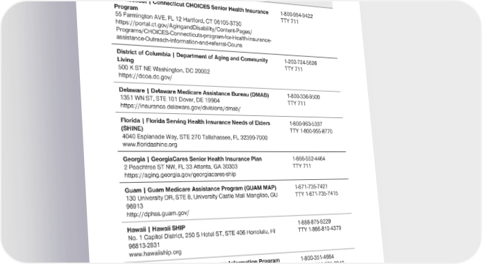 2024 Evidence of Coverage for UnitedHealthcare® Group Medicare Advantage PEBB Balance (PPO) Chapter 2: Important phone numbers and resources 21 State Health Insurance Assistance Programs (SHIP) - Contact Information Connecticut | Connecticut CHOICES Senior Health Insurance 1-800-994-9422 Program TTY 711 55 Farmington AVE, FL 12 Hartford, CT 06105-3730 https://portal.ct.gov/AgingandDisability/Content-Pages/ Programs/CHOICES-Connecticuts-program-for-Health-insurance- assistance-Outreach-Information-and-referral-Couns District of Columbia | Department of Aging and Community 1-202-724-5626 Living TTY 711 500 K ST NE Washington, DC 20002 https://dcoa.dc.gov/ Delaware | Delaware Medicare Assistance Bureau (DMAB) 1-800-336-9500 1351 WN ST, STE 101 Dover, DE 19904 TTY 711 https://insurance.delaware.gov/divisions/dmab/ Florida | Florida Serving Health Insurance Needs of Elders 1-800-963-5337 (SHINE) TTY 1-800-955-8770 4040 Esplanade Way, STE 270 Tallahassee, FL 32399-7000 www.floridashine.org Georgia | GeorgiaCares Senior Health Insurance Plan 1-866-552-4464 2 Peachtree ST NW, FL 33 Atlanta, GA 30303 TTY 711 https://aging.georgia.gov/georgiacares-ship Guam | Guam Medicare Assistance Program (GUAM MAP) 1-671-735-7421 130 University DR, STE 8, University Castle Mall Mangilao, GU TTY 1-671-735-7415 96913 http://dphss.guam.gov/ Hawaii | Hawaii SHIP 1-888-875-9229 No. 1 Capitol District, 250 S Hotel ST, STE 406 Honolulu, HI TTY 1-866-810-4379 96813-2831 www.hawaiiship.org Iowa | Iowa Senior Health Insurance Information Program 1-800-351-4664 (SHIIP) TTY 1-800-735-2942 1963 Bell Avenue, STE 100 Des Moines, IA 50315 shiip.iowa.gov