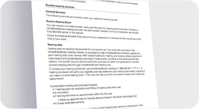2024 Evidence of Coverage for UnitedHealthcare® Group Medicare Advantage PEBB Balance (PPO) Chapter 4: Medical Benefits Chart (what is covered and what you pay) 139 Out-of-network benefits You can choose to use your in-network benefits with a network provider or use your out-of-network benefits with an out-of-network provider. Routine hearing services Covered Services The following services are covered under your additional hearing benefit: Routine Hearing Exam You can receive one hearing exam, every year through any hearing service provider, including a UnitedHealthcare Hearing provider. No authorization needed. For more information, see Access Your Benefits earlier in this section. Check the Medical Benefits Chart above for any copayment or coinsurance that may be due at the time of your exam. Hearing Aids Hearing aids are medical devices that fit in or near the ear. You must visit a provider in the UnitedHealthcare Hearing network or purchase through UnitedHealthcare Hearing’s website for your hearing aids to be covered. With UnitedHealthcare Hearing, you receive a broad selection of name brand and private-labeled prescription hearing aids, including some virtual appointment options. The benefit may be utilized toward the purchase of certain non-prescription (over-the- counter) hearing aids through UnitedHealthcare Hearing only. To access your hearing aid benefit, call UnitedHealthcare Hearing at 1-866-445-2071, TTY 711. A hearing counselor will verify your eligibility and help determine your hearing care needs, including if you need a routine hearing exam. Then they will help you find a convenient location and make your appointment. A prescription hearing aid purchase includes: · 1 hearing exam for evaluation and fitting of hearing aids every year · A trial period · 3 hearing aid follow-up appointments within the first year - 1 follow-up appointment for hearing aids purchased in the Silver technology level · A 3-year extended warranty The warranty for non-prescription (over-the-counter) hearing aids varies by manufacturer. Non- prescription hearing aids do not require any of the following: · A medical exam · A fitting by an audiologist · A written prescription