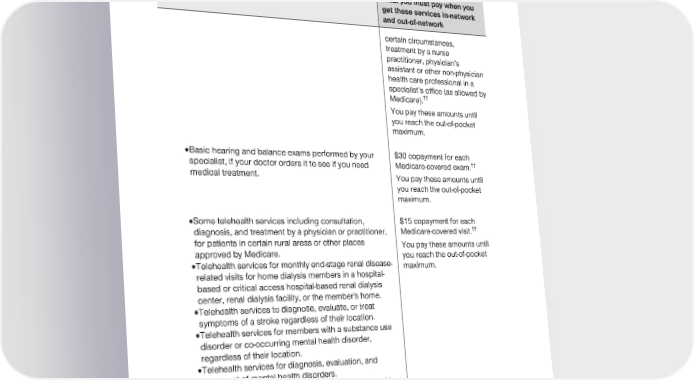 2024 Evidence of Coverage for UnitedHealthcare® Group Medicare Advantage PEBB Balance (PPO) Chapter 4: Medical Benefits Chart (what is covered and what you pay) 116 Services that are covered for you What you must pay when you get these services in-network and out-of-network certain circumstances, treatment by a nurse practitioner, physician’s assistant or other non-physician health care professional in a specialist’s office (as allowed by Medicare).†† You pay these amounts until you reach the out-of-pocket maximum. · Basic hearing and balance exams performed by your $30 copayment for each specialist, if your doctor orders it to see if you need Medicare-covered exam.†† medical treatment. You pay these amounts until you reach the out-of-pocket maximum. · Some telehealth services including consultation, $15 copayment for each diagnosis, and treatment by a physician or practitioner, Medicare-covered visit.†† for patients in certain rural areas or other places You pay these amounts until approved by Medicare. you reach the out-of-pocket · Telehealth services for monthly end-stage renal disease- maximum. related visits for home dialysis members in a hospital- based or critical access hospital-based renal dialysis center, renal dialysis facility, or the member's home. · Telehealth services to diagnose, evaluate, or treat symptoms of a stroke regardless of their location. · Telehealth services for members with a substance use disorder or co-occurring mental health disorder, regardless of their location. · Telehealth services for diagnosis, evaluation, and treatment of mental health disorders. · Telehealth services for mental health visits provided by rural health clinics and federally qualified health centers · Medicare-covered remote patient monitoring services