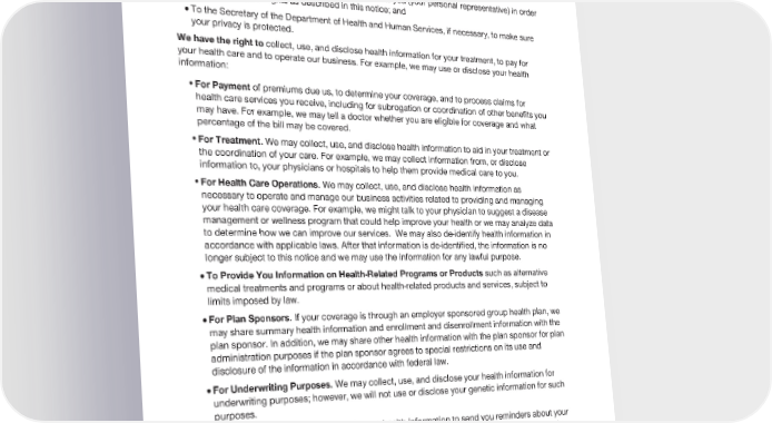 2024 Evidence of Coverage for UnitedHealthcare® Group Medicare Advantage PEBB Balance (PPO) Chapter 8: Your rights and responsibilities 183 We collect, use, and disclose your health information to provide that information: · To you or someone who has the legal right to act for you (your personal representative) in order to administer your rights as described in this notice; and · To the Secretary of the Department of Health and Human Services, if necessary, to make sure your privacy is protected. collect, use, and disclose health information for your treatment, to pay for We have the right to your health care and to operate our business. For example, we may use or disclose your health information: Ÿ For Payment of premiums due us, to determine your coverage, and to process claims for health care services you receive, including for subrogation or coordination of other benefits you may have. For example, we may tell a doctor whether you are eligible for coverage and what percentage of the bill may be covered. Ÿ For Treatment. We may collect, use, and disclose health information to aid in your treatment or the coordination of your care. For example, we may collect information from, or disclose information to, your physicians or hospitals to help them provide medical care to you. Ÿ For Health Care Operations. We may collect, use, and disclose health information as necessary to operate and manage our business activities related to providing and managing your health care coverage. For example, we might talk to your physician to suggest a disease management or wellness program that could help improve your health or we may analyze data to determine how we can improve our services. We may also de-identify health information in accordance with applicable laws. After that information is de-identified, the information is no longer subject to this notice and we may use the information for any lawful purpose. · To Provide You Information on Health-Related Programs or Products such as alternative medical treatments and programs or about health-related products and services, subject to limits imposed by law. · For Plan Sponsors. If your coverage is through an employer sponsored group health plan, we may share summary health information and enrollment and disenrollment information with the plan sponsor. In addition, we may share other health information with the plan sponsor for plan administration purposes if the plan sponsor agrees to special restrictions on its use and disclosure of the information in accordance with federal law. · For Underwriting Purposes. We may collect, use, and disclose your health information for underwriting purposes; however, we will not use or disclose your genetic information for such purposes. · For Reminders. We may use or disclose health information to send you reminders about your benefits or care, such as appointment reminders with providers who provide medical care to you. · For Communications to You. We may communicate, electronically or via telephone, these treatment, payment or health care operation messages using telephone numbers or email addresses you provide to us.