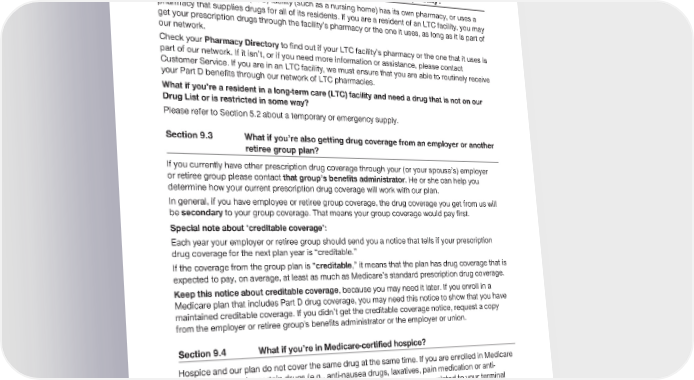 2024 Evidence of Coverage for UnitedHealthcare® Group Medicare Advantage PEBB Balance (PPO) Chapter 5: Using the plan’s coverage for Part D prescription drugs 159 Section 9.2 What if you’re a resident in a long-term care (LTC) facility? Usually, a long-term care (LTC) facility (such as a nursing home) has its own pharmacy, or uses a pharmacy that supplies drugs for all of its residents. If you are a resident of an LTC facility, you may get your prescription drugs through the facility’s pharmacy or the one it uses, as long as it is part of our network. Check your Pharmacy Directory to find out if your LTC facility’s pharmacy or the one that it uses is part of our network. If it isn’t, or if you need more information or assistance, please contact Customer Service. If you are in an LTC facility, we must ensure that you are able to routinely receive your Part D benefits through our network of LTC pharmacies. What if you’re a resident in a long-term care (LTC) facility and need a drug that is not on our Drug List or is restricted in some way? Please refer to Section 5.2 about a temporary or emergency supply. Section 9.3 What if you’re also getting drug coverage from an employer or another retiree group plan? If you currently have other prescription drug coverage through your (or your spouse’s) employer or retiree group please contact that group’s benefits administrator. He or she can help you determine how your current prescription drug coverage will work with our plan. In general, if you have employee or retiree group coverage, the drug coverage you get from us will be secondary to your group coverage. That means your group coverage would pay first. Special note about ‘creditable coverage’: Each year your employer or retiree group should send you a notice that tells if your prescription drug coverage for the next plan year is “creditable.” If the coverage from the group plan is “creditable,” it means that the plan has drug coverage that is expected to pay, on average, at least as much as Medicare’s standard prescription drug coverage. Keep this notice about creditable coverage, because you may need it later. If you enroll in a Medicare plan that includes Part D drug coverage, you may need this notice to show that you have maintained creditable coverage. If you didn’t get the creditable coverage notice, request a copy from the employer or retiree group's benefits administrator or the employer or union. Section 9.4 What if you’re in Medicare-certified hospice? Hospice and our plan do not cover the same drug at the same time. If you are enrolled in Medicare hospice and require certain drugs (e.g., anti-nausea drugs, laxatives, pain medication or anti- anxiety drugs) that are not covered by your hospice because they are unrelated to your terminal illness and related conditions, our plan must receive notification from either the prescriber or your hospice provider that the drugs are unrelated before our plan can cover the drugs. To prevent delays in receiving these drugs that should be covered by our plan, ask your hospice provider or prescriber to provide notification before your prescription is filled.