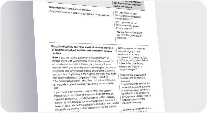 2024 Evidence of Coverage for UnitedHealthcare® Group Medicare Advantage PEBB Balance (PPO) Chapter 4: Medical Benefits Chart (what is covered and what you pay) 113 Services that are covered for you What you must pay when you get these services in-network and out-of-network Outpatient substance abuse services $30 copayment for each Outpatient treatment and counseling for substance abuse. Medicare-covered individual therapy session.†† $15 copayment for each Medicare-covered group therapy session.†† You pay these amounts until you reach the out-of-pocket maximum. Outpatient surgery and other medical services provided $250 copayment for Medicare- at hospital outpatient facilities and ambulatory surgical covered surgery or other centers services at an outpatient Note: If you are having surgery in a hospital facility, you hospital or ambulatory surgical should check with your provider about whether you will be center, including but not limited an inpatient or outpatient. Unless the provider writes an to hospital or other facility order to admit you as an inpatient to the hospital, you are an charges and physician or surgical charges.†† outpatient and pay the cost-sharing amounts for outpatient surgery. Even if you stay in the hospital overnight, you might You pay these amounts until still be considered an “outpatient.” This is called an you reach the out-of-pocket “Outpatient Observation” stay. If you are not sure if you are maximum. an outpatient, you should ask your doctor or the hospital Outpatient surgical services that staff. can be delivered in an available If you receive any services or items other than surgery, ambulatory surgery center must including but not limited to diagnostic tests, therapeutic be delivered in an ambulatory services, prosthetics, orthotics, supplies or Part B drugs, surgery center unless a hospital there may be additional cost-sharing for those services or outpatient department is items. Please refer to the appropriate section in this chart for medically necessary. the additional service or item you received for the specific cost-sharing required. $250 copayment for Medicare- See “Colorectal cancer screening” earlier in this chart for covered observation at an screening and diagnostic colonoscopy benefit information. outpatient hospital or ambulatory surgical center.††