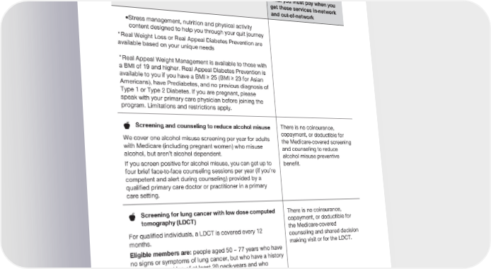2024 Evidence of Coverage for UnitedHealthcare® Group Medicare Advantage PEBB Balance (PPO) Chapter 4: Medical Benefits Chart (what is covered and what you pay) 122 Services that are covered for you What you must pay when you get these services in-network and out-of-network · Stress management, nutrition and physical activity content designed to help you through your quit journey *Real Weight Loss or Real Appeal Diabetes Prevention are available based on your unique needs *Real Appeal Weight Management is available to those with a BMI of 19 and higher. Real Appeal Diabetes Prevention is available to you if you have a BMI ≥ 25 (BMI ≥ 23 for Asian Americans), have Prediabetes, and no previous diagnosis of Type 1 or Type 2 Diabetes. If you are pregnant, please speak with your primary care physician before joining the program. Limitations and restrictions apply. There is no coinsurance, Screening and counseling to reduce alcohol misuse copayment, or deductible for We cover one alcohol misuse screening per year for adults the Medicare-covered screening with Medicare (including pregnant women) who misuse and counseling to reduce alcohol, but aren’t alcohol dependent. alcohol misuse preventive If you screen positive for alcohol misuse, you can get up to benefit. four brief face-to-face counseling sessions per year (if you’re competent and alert during counseling) provided by a qualified primary care doctor or practitioner in a primary care setting. There is no coinsurance, Screening for lung cancer with low dose computed tomography (LDCT) copayment, or deductible for For qualified individuals, a LDCT is covered every 12 the Medicare-covered months. counseling and shared decision making visit or for the LDCT. Eligible members are: people aged 50 – 77 years who have no signs or symptoms of lung cancer, but who have a history of tobacco smoking of at least 20 pack-years and who currently smoke or have quit smoking within the last 15 years, who receive a written order for LDCT during a lung cancer screening counseling and shared decision making