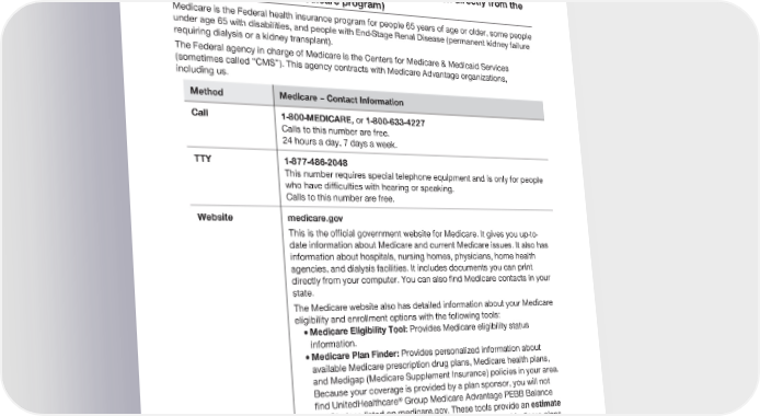 2024 Evidence of Coverage for UnitedHealthcare® Group Medicare Advantage PEBB Balance (PPO) Chapter 2: Important phone numbers and resources 17 Section 2 Medicare (how to get help and information directly from the federal Medicare program) Medicare is the Federal health insurance program for people 65 years of age or older, some people under age 65 with disabilities, and people with End-Stage Renal Disease (permanent kidney failure requiring dialysis or a kidney transplant). The Federal agency in charge of Medicare is the Centers for Medicare & Medicaid Services (sometimes called “CMS”). This agency contracts with Medicare Advantage organizations, including us. Method Medicare – Contact Information Call 1-800-MEDICARE, or 1-800-633-4227 Calls to this number are free. 24 hours a day, 7 days a week. TTY 1-877-486-2048 This number requires special telephone equipment and is only for people who have difficulties with hearing or speaking. Calls to this number are free. Website medicare.gov This is the official government website for Medicare. It gives you up-to- date information about Medicare and current Medicare issues. It also has information about hospitals, nursing homes, physicians, home health agencies, and dialysis facilities. It includes documents you can print directly from your computer. You can also find Medicare contacts in your state. The Medicare website also has detailed information about your Medicare eligibility and enrollment options with the following tools: · Medicare Eligibility Tool: Provides Medicare eligibility status information. · Medicare Plan Finder: Provides personalized information about available Medicare prescription drug plans, Medicare health plans, and Medigap (Medicare Supplement Insurance) policies in your area. Because your coverage is provided by a plan sponsor, you will not find UnitedHealthcare® Group Medicare Advantage PEBB Balance (PPO) plans listed on medicare.gov. These tools provide an estimate of what your out-of-pocket costs might be in different Medicare plans. You can also use the website to tell Medicare about any complaints you have about UnitedHealthcare® Group Medicare Advantage PEBB Balance (PPO):