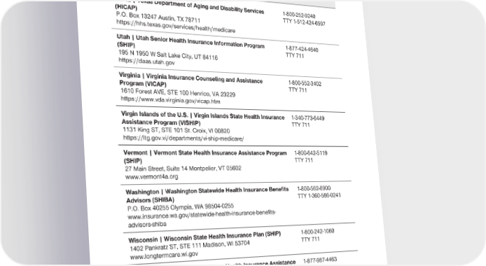2024 Evidence of Coverage for UnitedHealthcare® Group Medicare Advantage PEBB Balance (PPO) Chapter 2: Important phone numbers and resources 26 State Health Insurance Assistance Programs (SHIP) - Contact Information Texas | Texas Department of Aging and Disability Services 1-800-252-9240 (HICAP) TTY 1-512-424-6597 P.O. Box 13247 Austin, TX 78711 https://hhs.texas.gov/services/health/medicare Utah | Utah Senior Health Insurance Information Program 1-877-424-4640 (SHIP) TTY 711 195 N 1950 W Salt Lake City, UT 84116 https://daas.utah.gov Virginia | Virginia Insurance Counseling and Assistance 1-800-552-3402 Program (VICAP) TTY 711 1610 Forest AVE, STE 100 Henrico, VA 23229 https://www.vda.virginia.gov/vicap.htm Virgin Islands of the U.S. | Virgin Islands State Health Insurance 1-340-773-6449 Assistance Program (VISHIP) TTY 711 1131 King ST, STE 101 St. Croix, VI 00820 https://ltg.gov.vi/departments/vi-ship-medicare/ Vermont | Vermont State Health Insurance Assistance Program 1-800-642-5119 (SHIP) TTY 711 27 Main Street, Suite 14 Montpelier, VT 05602 www.vermont4a.org Washington | Washington Statewide Health Insurance Benefits 1-800-562-6900 Advisors (SHIBA) TTY 1-360-586-0241 P.O. Box 40255 Olympia, WA 98504-0255 www.insurance.wa.gov/statewide-health-insurance-benefits- advisors-shiba Wisconsin | Wisconsin State Health Insurance Plan (SHIP) 1-800-242-1060 1402 Pankratz ST, STE 111 Madison, WI 53704 TTY 711 www.longtermcare.wi.gov West Virginia | West Virginia State Health Insurance Assistance 1-877-987-4463 Program (WV SHIP) TTY 711 1900 Kanawha BLVD E Charleston, WV 25305 www.wvship.org